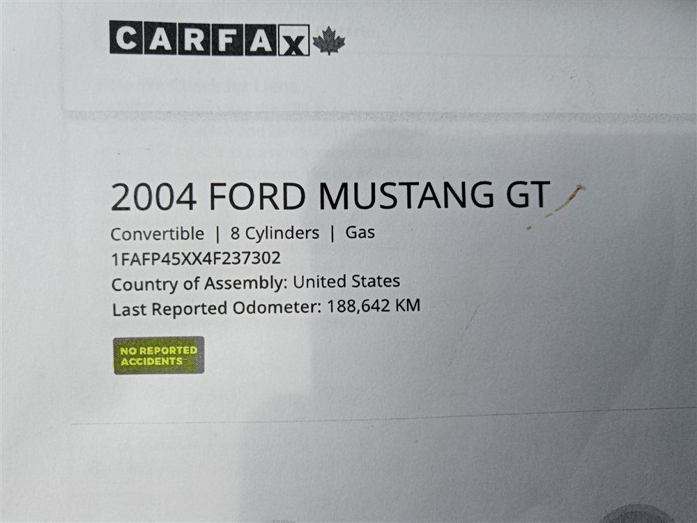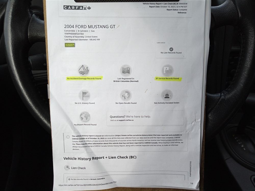 Automatic transmission and 4.6 Litre Engine, 8 Cylinder, Rear Wheel Drive, 221025 KMGrey, 4 PassengerDeclarations - Out of Province, NB, NS, ONT , Currently BC Registered, No Reported Accidents,Power Steering, Power Brakes, Intermittent Wipers, Dual Air Bag, AM/FM Stereo , Rear Defroster, Bucket Seats, Anti Lock Brakes, Front Disc Brakes-Air Conditioning, Power Windows, Power Locks, Keyless Entry, Tilt Steering, Cruise Control, Alloy Wheels, Anti Theft, CD Player, CD Stacker, Leather Seats, Power Seats, Traction Control, Fog Lights, Spare Key, Power Mirrors Auction Notes : Rear Spoiler, Mach Audio, Custom Dual Exhaust, 40th Anniversary Edition, CarFax Shows Good Service History (37 Records) And The Following Work: Outer Tie Rods Replaced @181k, Drive Belt Tensioner, Sparks Plugs, Idler Pulley Replaced @186438k, Very Small Crack In Windshield, Spare Key