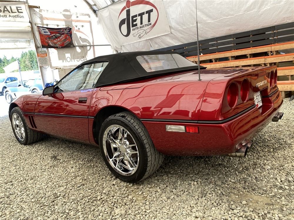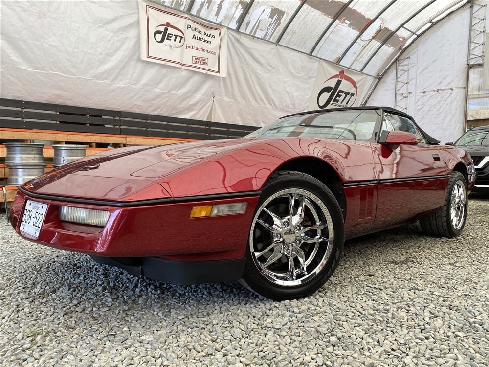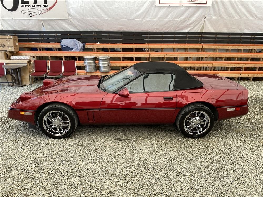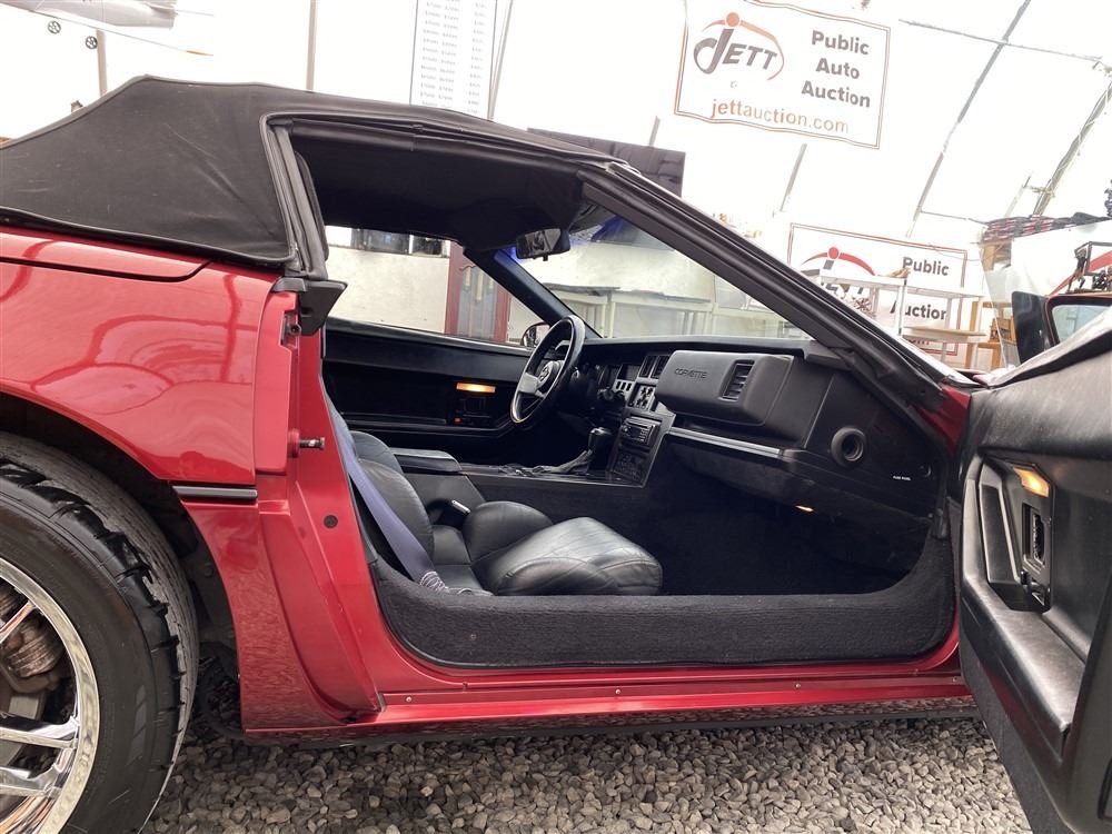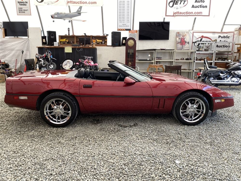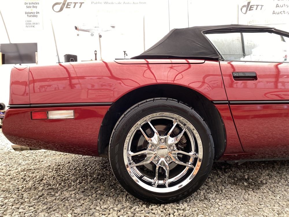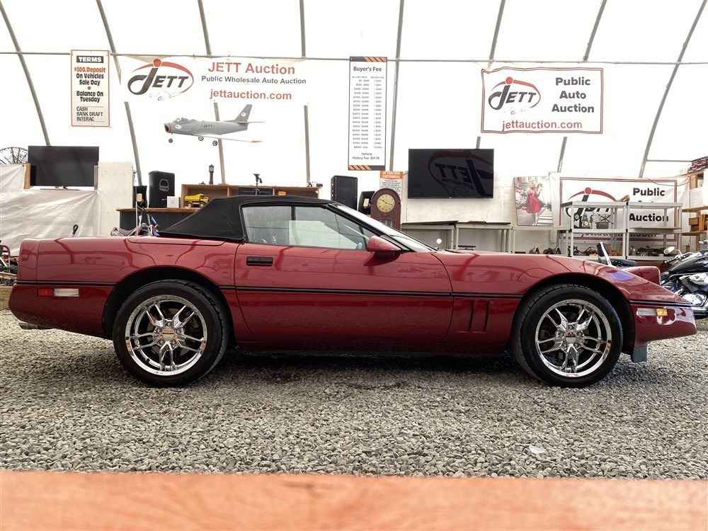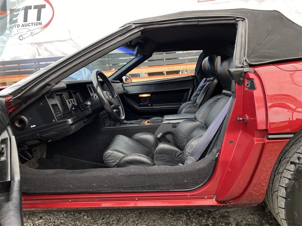 1989 CHEVROLET CORVETTE CONVERTIBLE, RED, 165,536 KMS, 5.7L, 8 CYLINDER, GASOLINE, AUTOMATIC, TRANSMISSION, REAR WHEEL DRIVE, 2 PASSENGER. AIR CONDITIONING, POWER WINDOWS, POWER LOCKS, TILT STEERING, CRUISE CONTROL, ALLOY WHEELS, CD PLAYER, AFTERMARKET STEREO, LEATHER SEATS, POWER SEATS, HEATED MIRRORS, INFOTAINMENT CENTER, FOG LIGHTS, SPARE KEY, POWER MIRRORS, . DECLARATIONS: 6 ACCIDENTS 1 GLASS CLAIM, TOTALING $7372. SERVICE HISTORY SHOWS5 RECORDS.