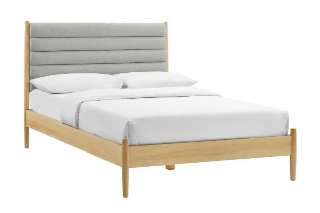 CAMILLE TRANSITIONAL QUEENSIZE PLATFORM BEDFRAME - LIGHT WOOD/ GREY, RETAIL $799