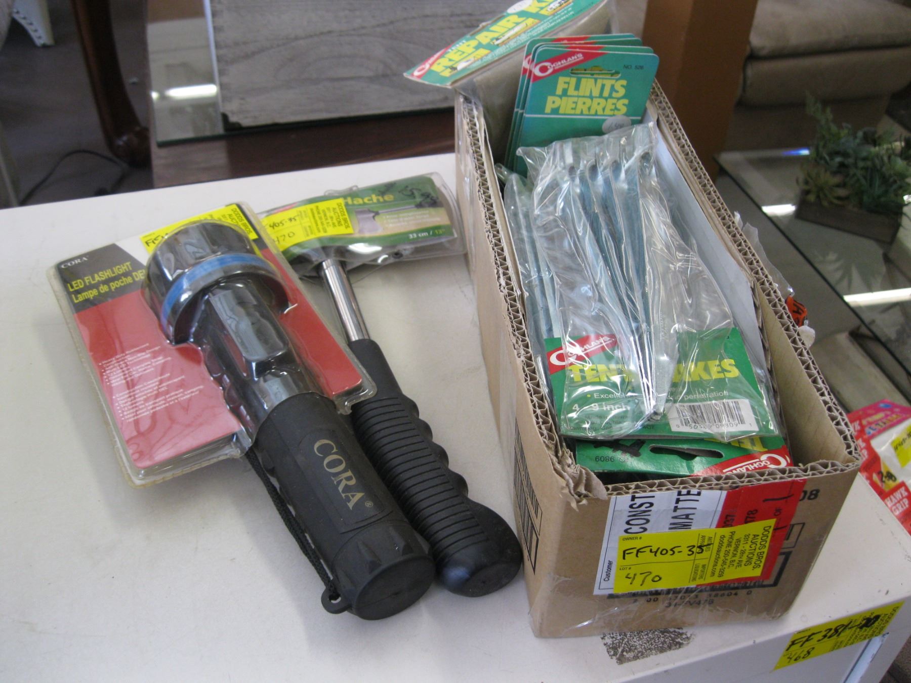 CAMP AXE, FLASHLIGHT, TENT PEGS, FLINTS
