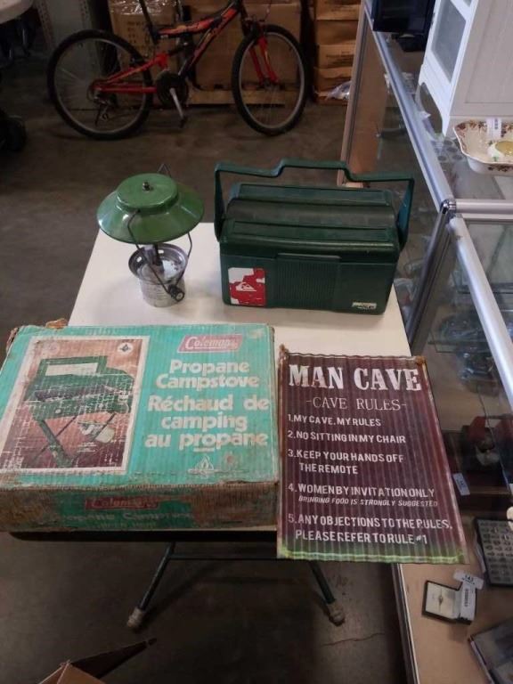 CAMP STOVE, LANTERN, COOLER AND MAN CAVE SIGN