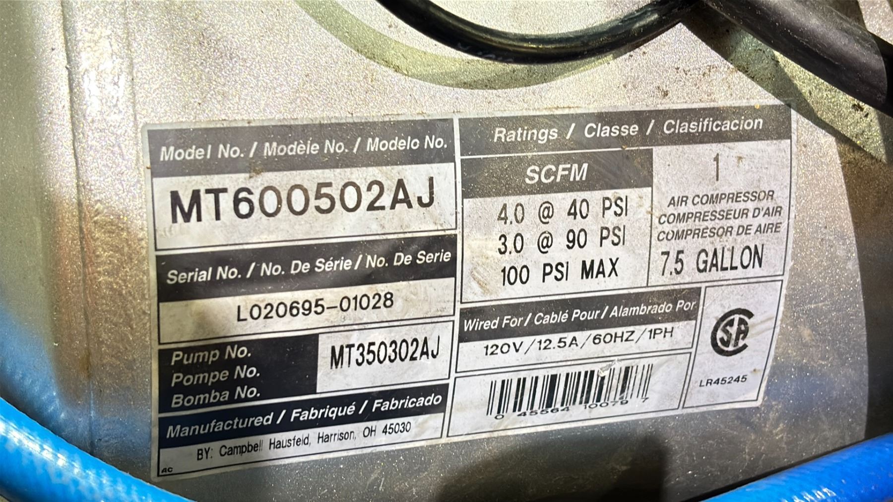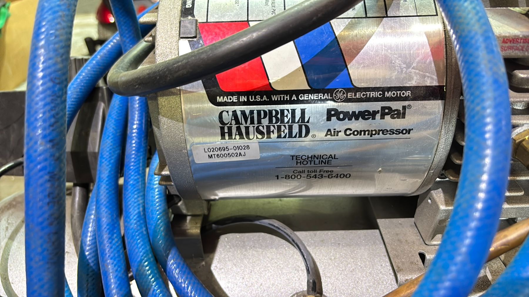 CAMPBELL HAUSFELD MT600502AJ INDUSTRIAL HORIZONTAL AIR COMPRESSOR WITH HOSE & NOZZLE