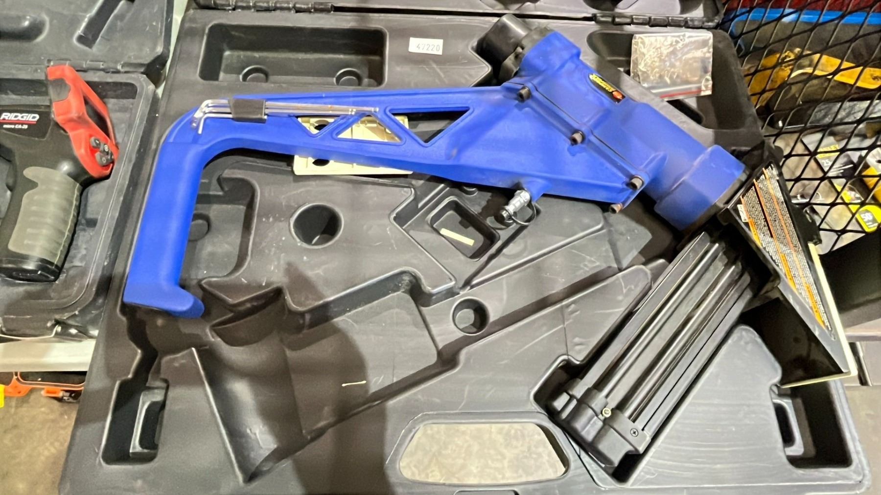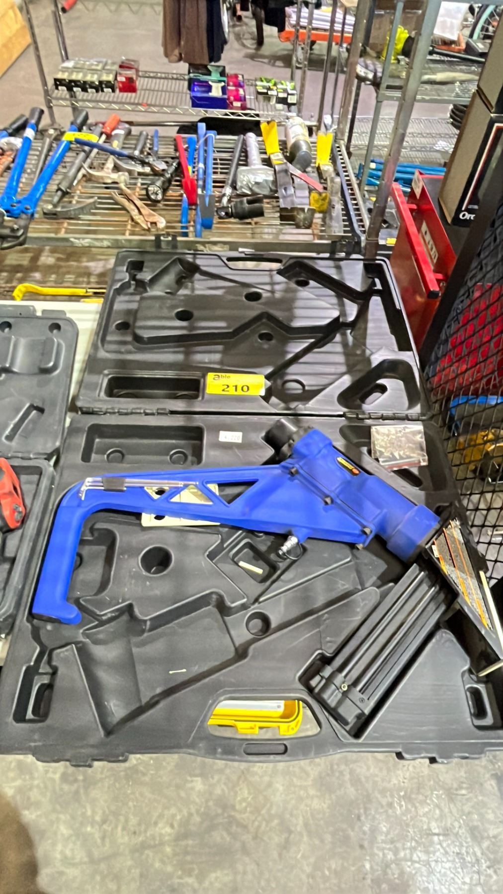 CAMPBELL HAUSFELD PNEUMATIC NAIL GUN IN A HARD TRANSPORT CASE