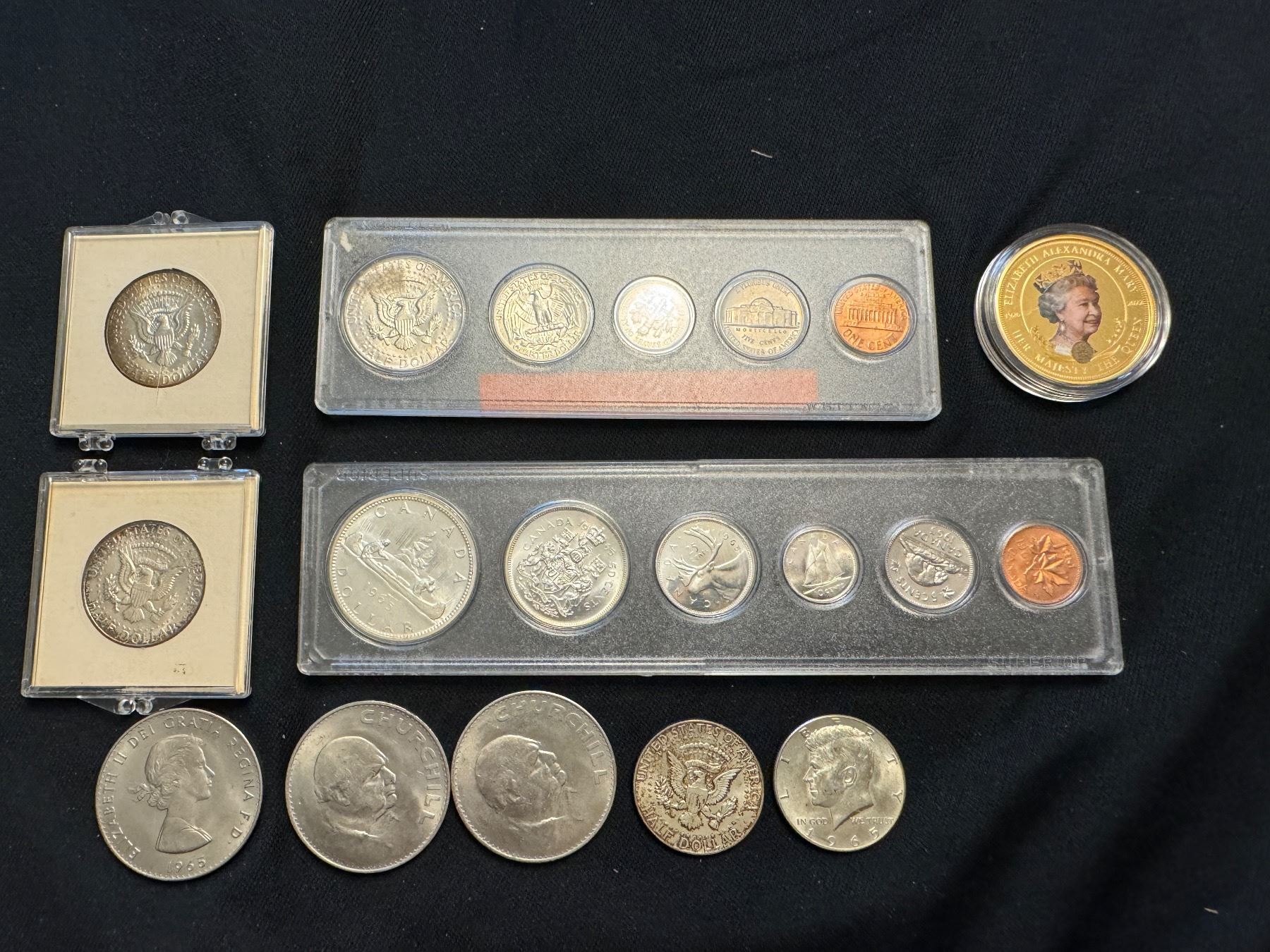 CANADA AND US COIN ASSORTMENT, CHURCHILL COMMEMORATIVE COINS, ETC