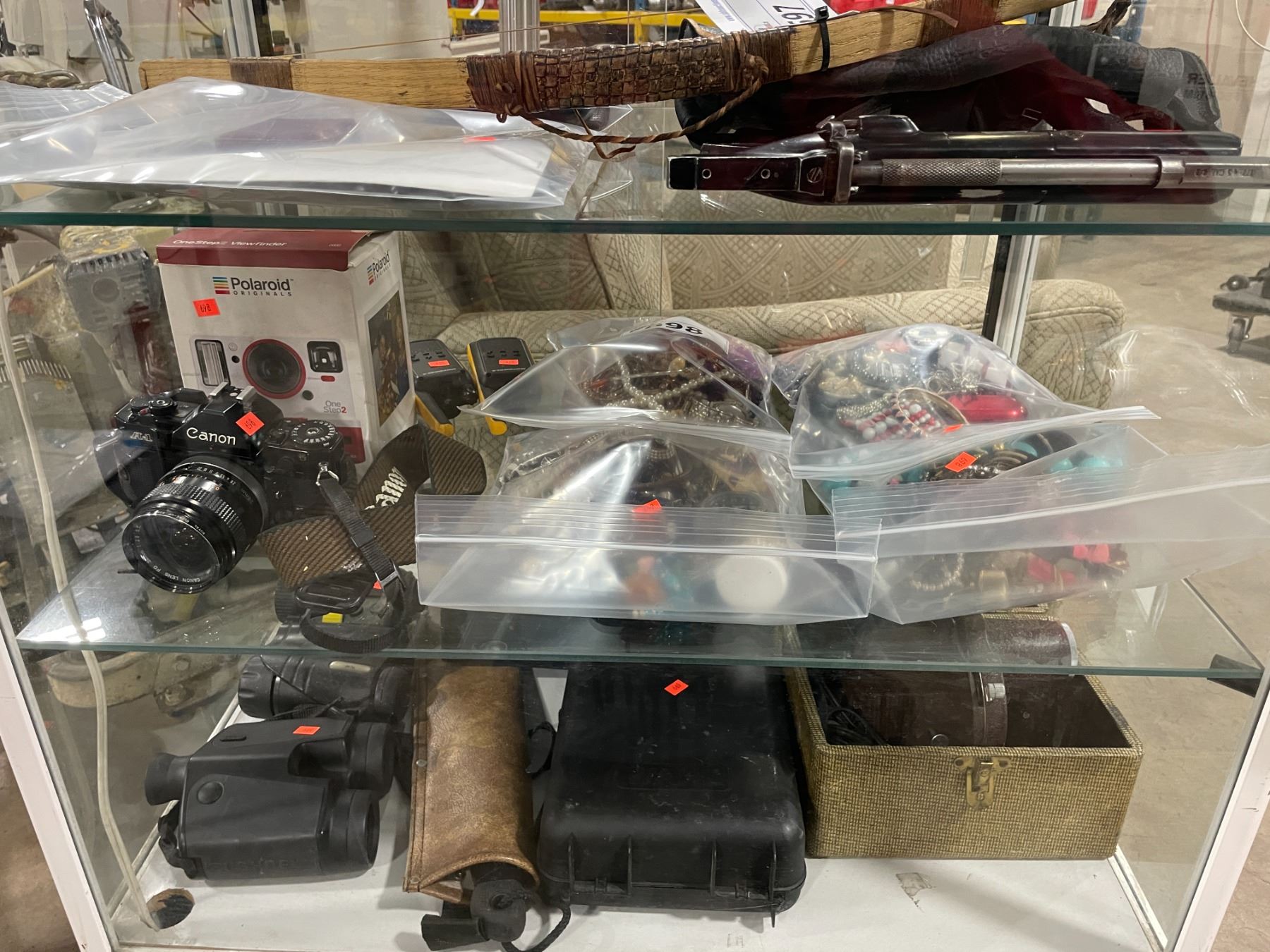 CANON A-1 FILM CAMERA, POLAROID CAMERA, 2 MOTOROLA RADIOS, & 4 BAGS OF ASSORTED COSTUME JEWELRY