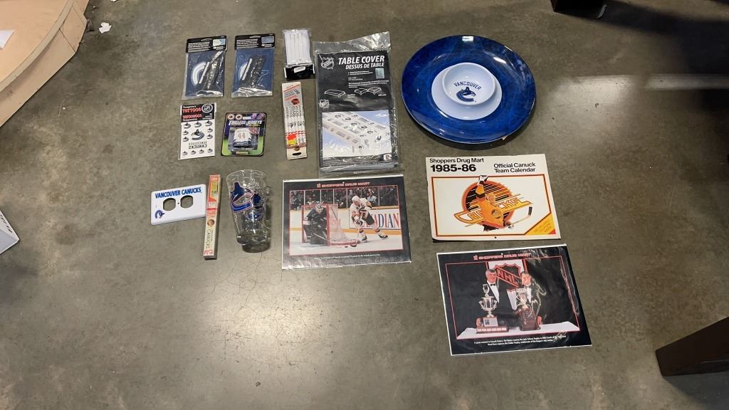 CANUCKS LOT - CHIP/ DIP BOWL, TATTOOS, CAR FLAGS, TABLECLOTH, TOOTHBRUSH, ORNAMENT, PENCILS, CALENDAR, 2 GLASSES AND POSTER