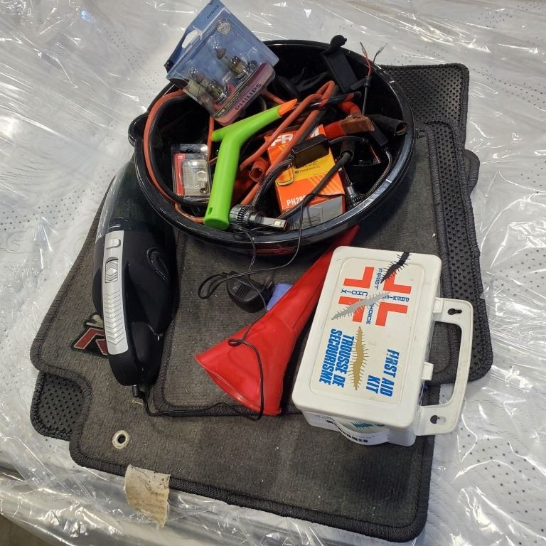 CAR MATS, DRAIN PAN, SMALL FIRST AID KIT, ETC