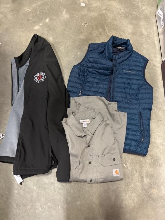 CARHARDT SHIRT, EDDIE BAUER VEST AND OTHERS WITH HANGER OF VARIOUS BELTS
