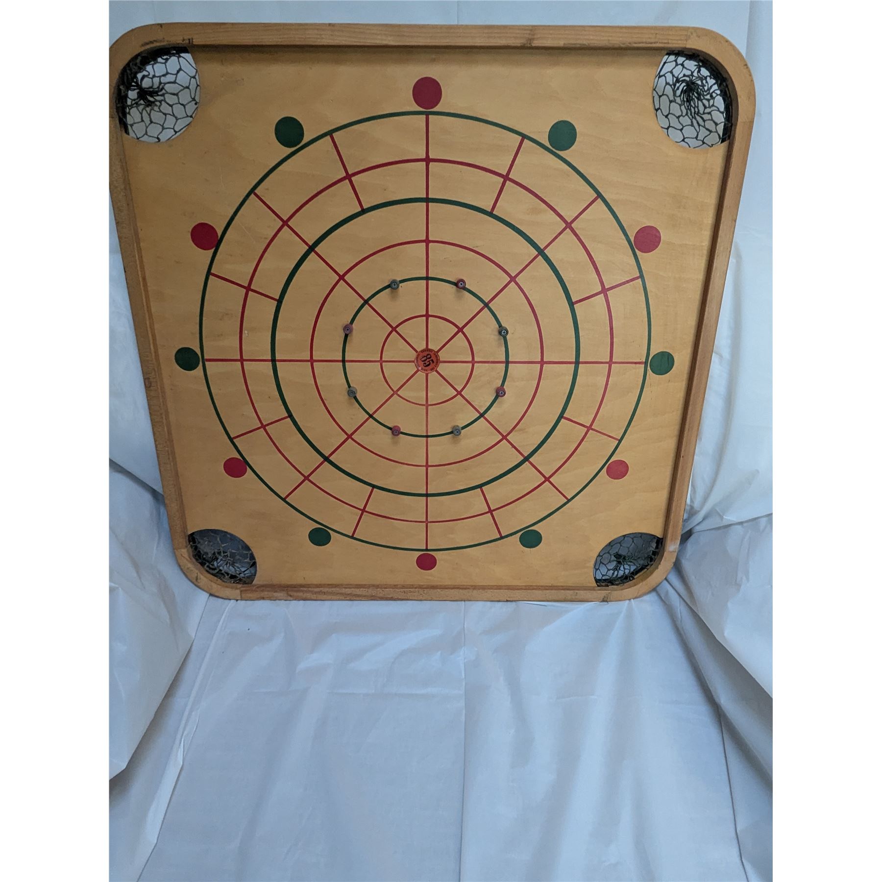 The game is played on a square wooden board with four pockets in the corners. 28.5" x "28.5 x 2.35"