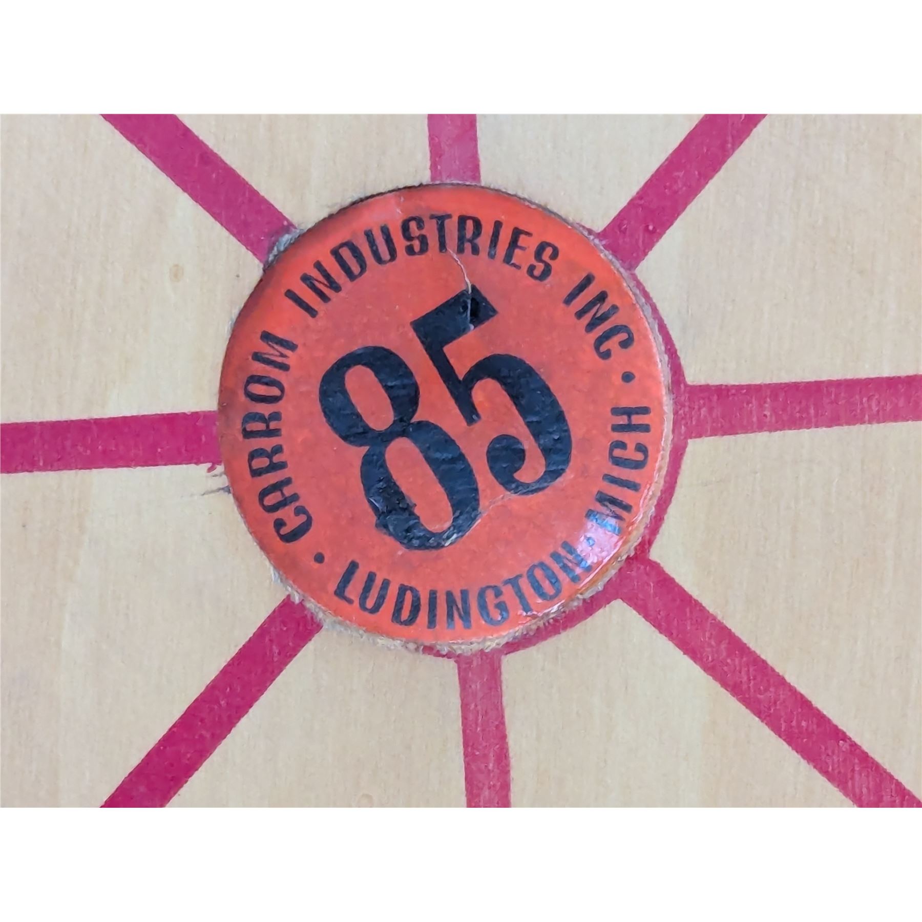 The vintage board in the image from the mid-20th century, manufactured by CARROM INDUSTRIES INC. Ludington, Michagan.