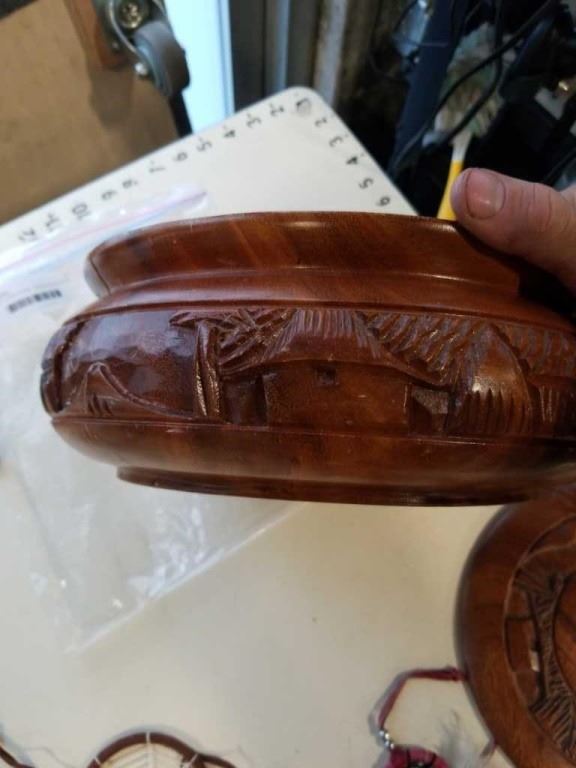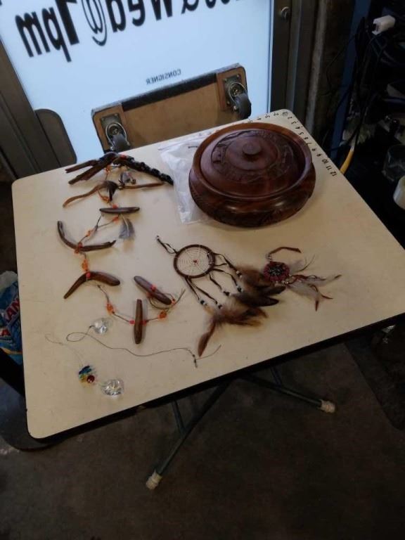 CARVED LIDDED BOWL, DREAM CATCHERS AND CARVED WOOD DECORATIONS