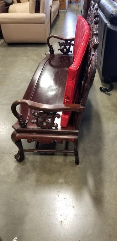 CARVED ROSEWOOD INLAID MARBLE BENCH, 65 INCH WIDE, 42 INCH TALL AT HEIGHT OF BACK, SOLID SEAT WITH CUSHION