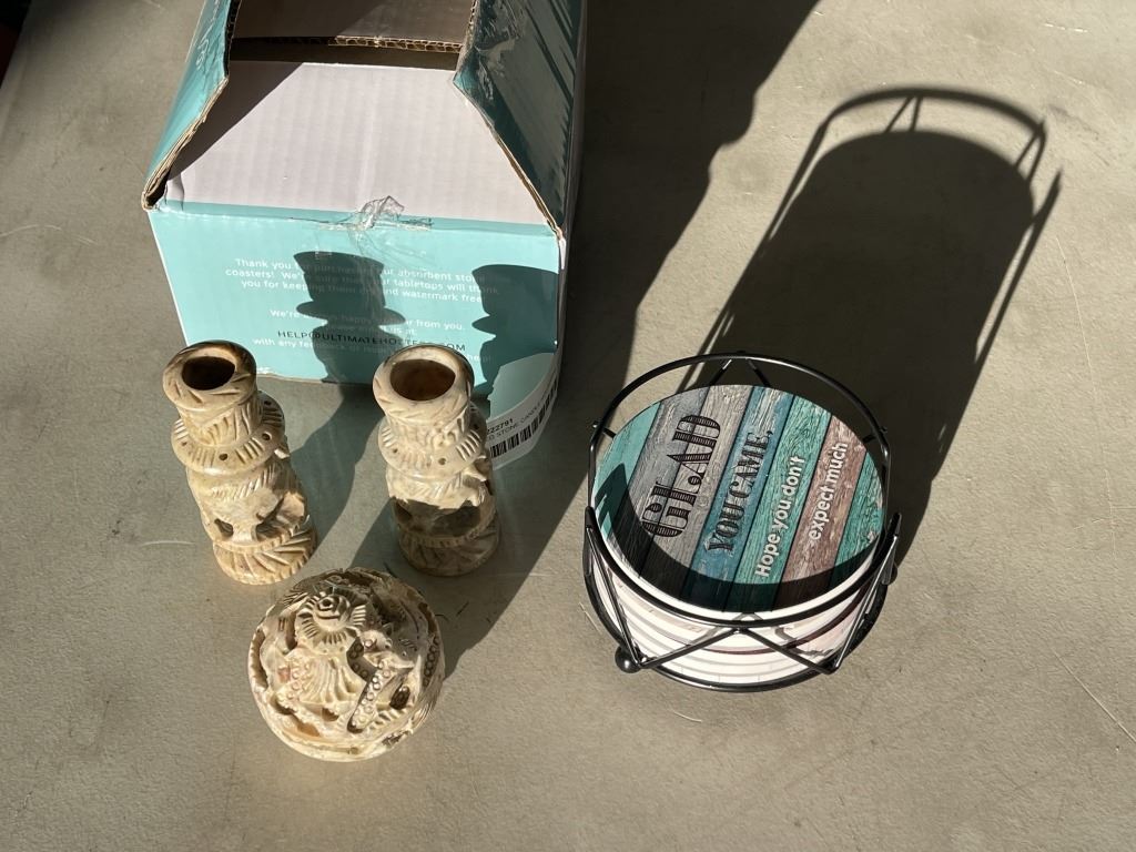 CARVED STONE CANDLE HOLDEWRS, AND LIDDED DISH , AND NEW SET OF 6 STONE COASTERS WITH HOLDER