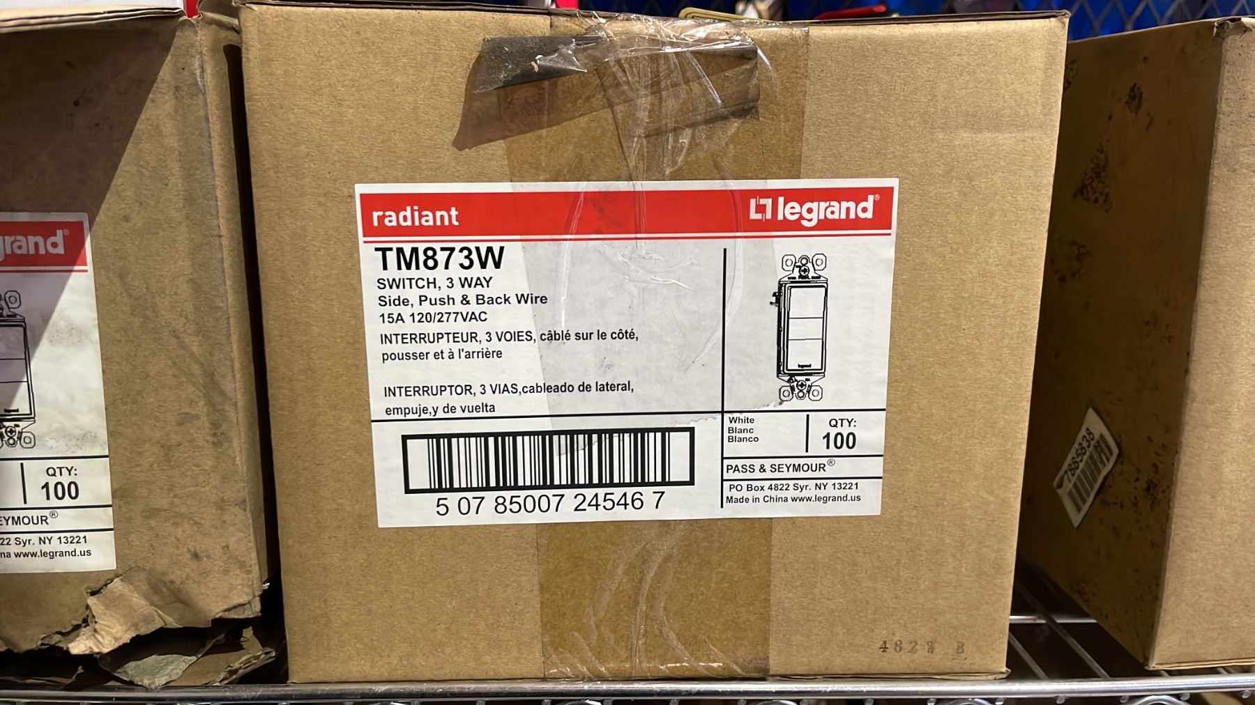 CASE OF (100) LEGRAND RADIANT TM873W LIGHT SWITCH, 3-WAY SIDE, PUSH & BACK WIRE 15A 120/277VAC