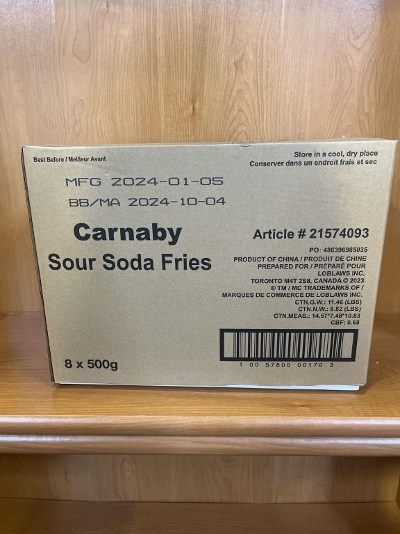 CASE OF NEW SOUR SODA POP FRIES CANDY, 8 TUBS, 500G EACH BB OCT/2024