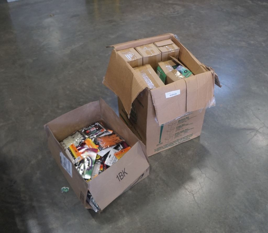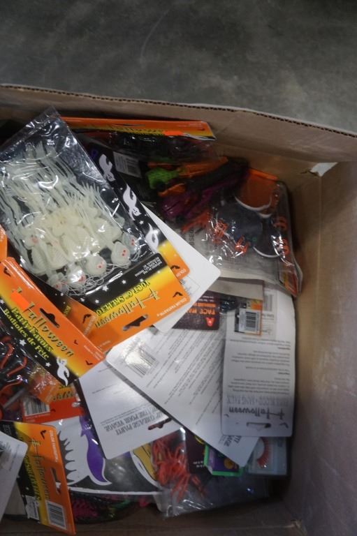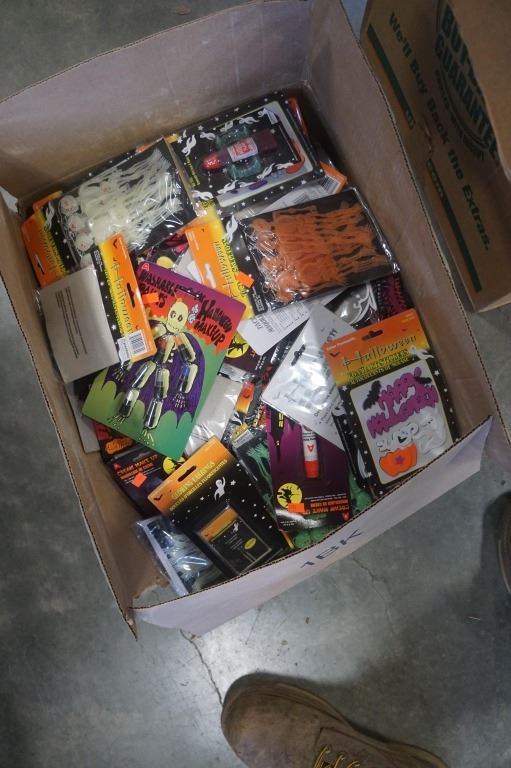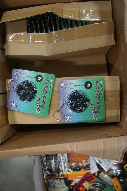CASE OF PUZZLE SPHERE KEYCHAINS AND BOX OF HALLOWEEN DECOR