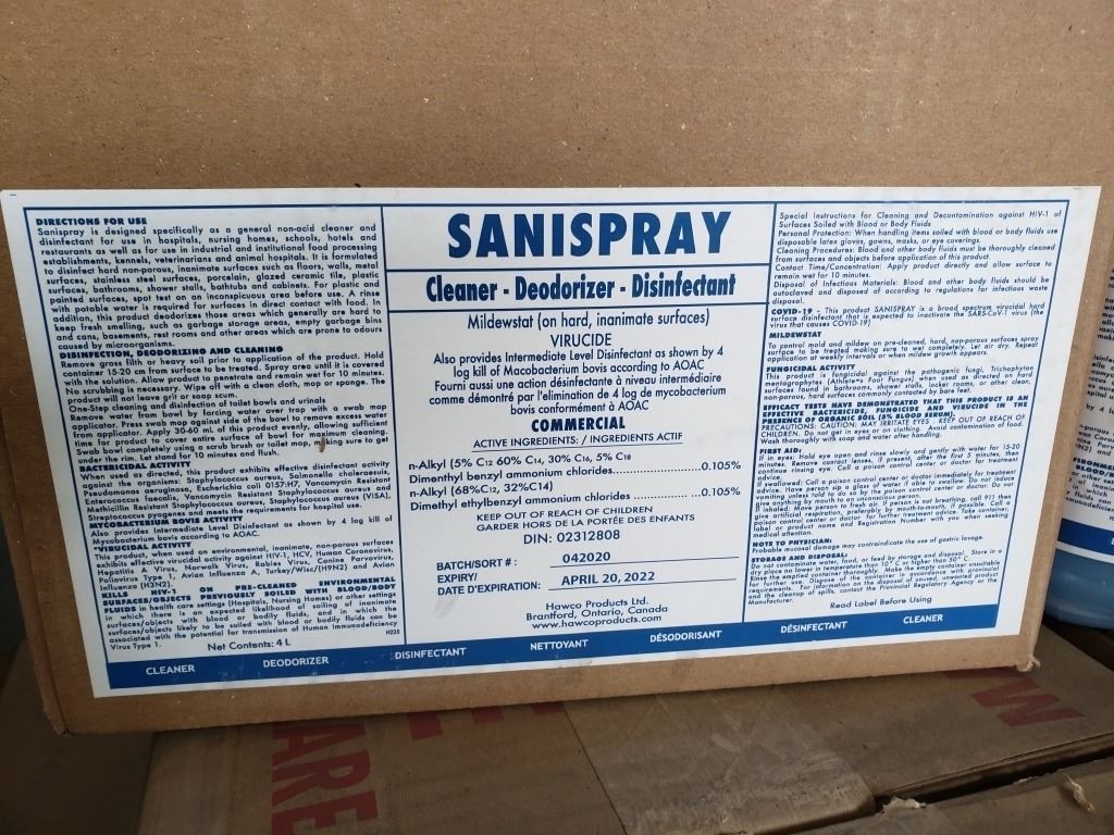 CASE OF SANISPRAY DISINFECTANT - 4 BOTTLES 4L EACH - 16 LITERS TOTAL
