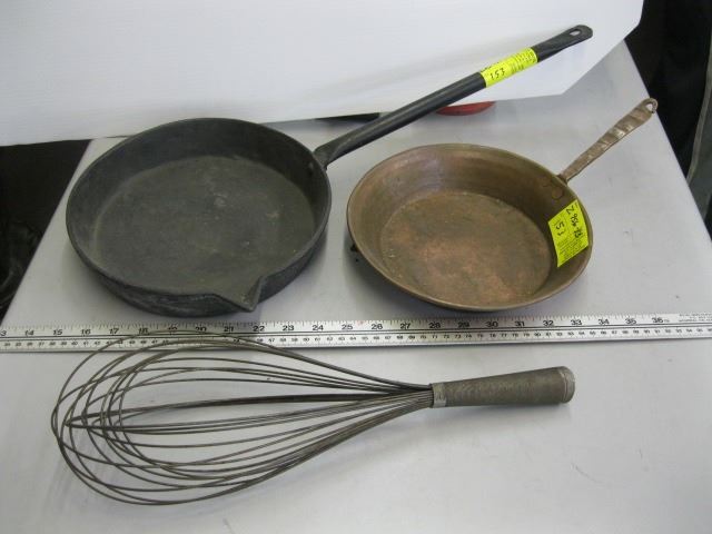 CAST FRY PAN, COPPER FRY PAN & A WHISK