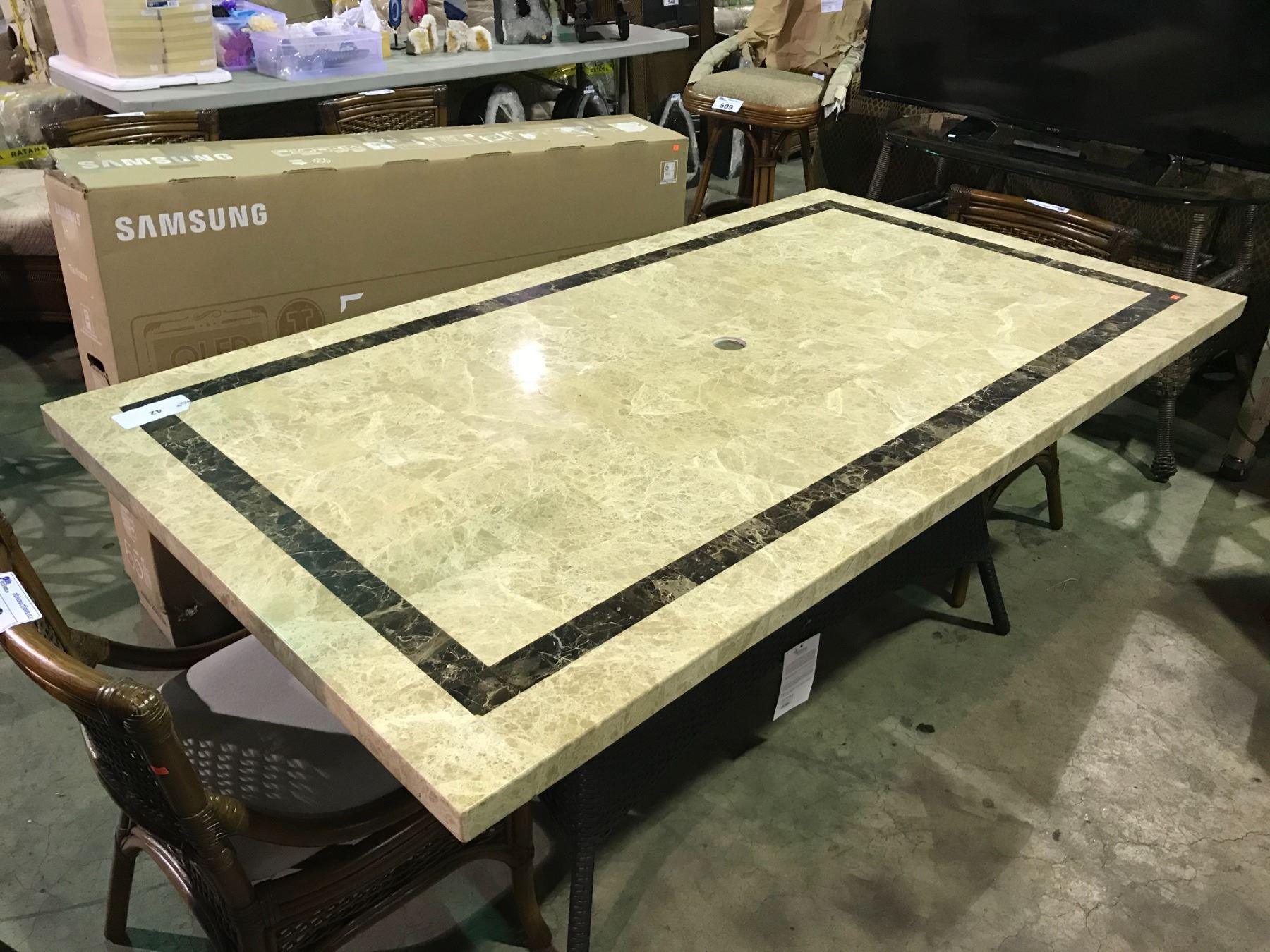 CATANIA 71"W X 39"D BEIGE STONE TOP RECTANGULAR OUTDOOR PATIO TABLE WITH 2 TONE BROWN RATAN BASE