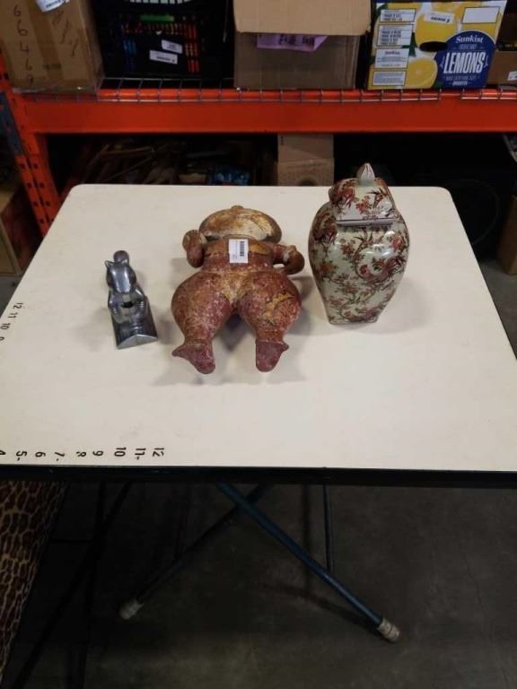 CERAMIC FIGURE WITH GINGER JAR, AND METAL NUTCRACKER