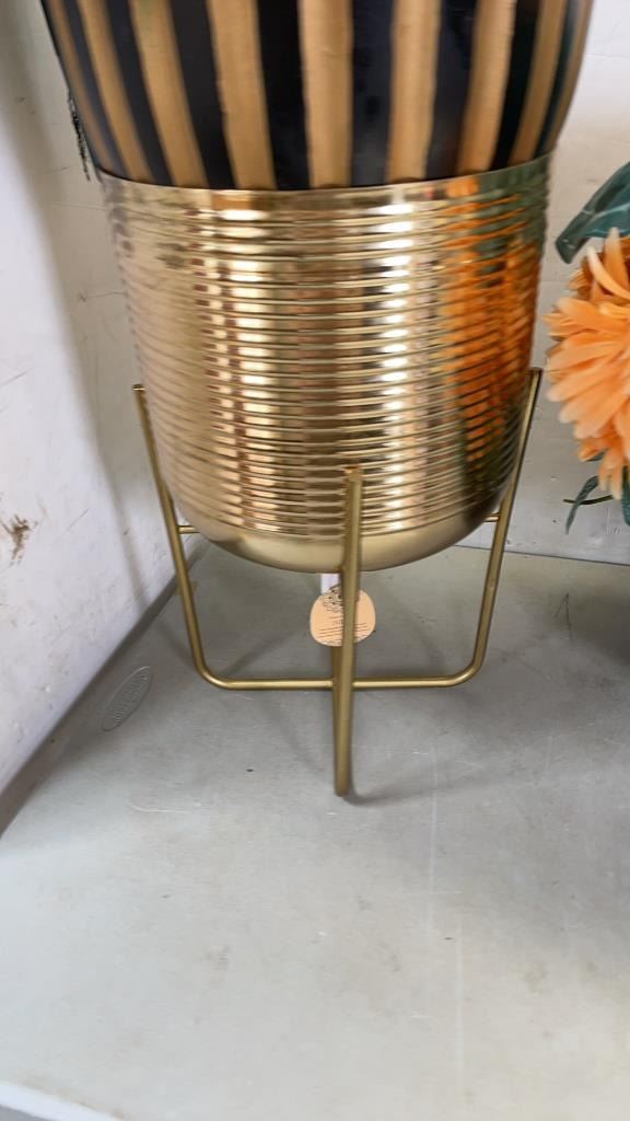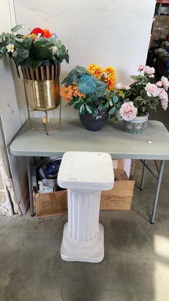 CERAMIC PEDESTAL 29" TALL WITH 3 ARTIFICIAL PLANTS AND METAL STAND