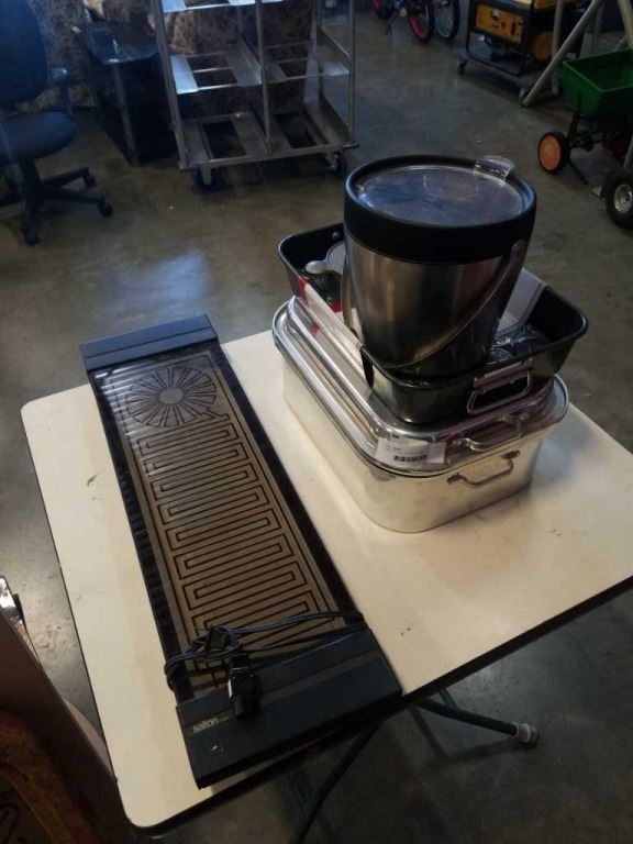 CHAFING DISH, ROASTING PAN, HAMBURGER PRESS, INSULATED ICE BUCKET AND SALTON HOTTRAY