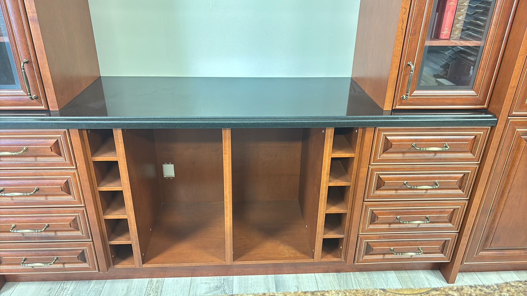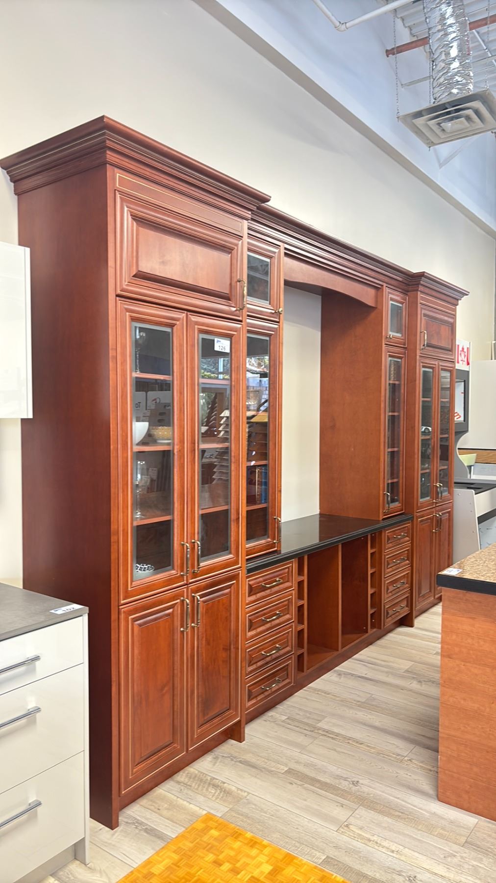 CHERRY LOOK 14 DOOR 8 DRAWER BOOKSHELF CABINET - 144"W X 22"D X 101"H CABINETS WILL NEED TO BE REMOVED FROM THE WALL BY THE SUCCESSFUL BIDDER - PLEASE BRING HELP, MANPOWER