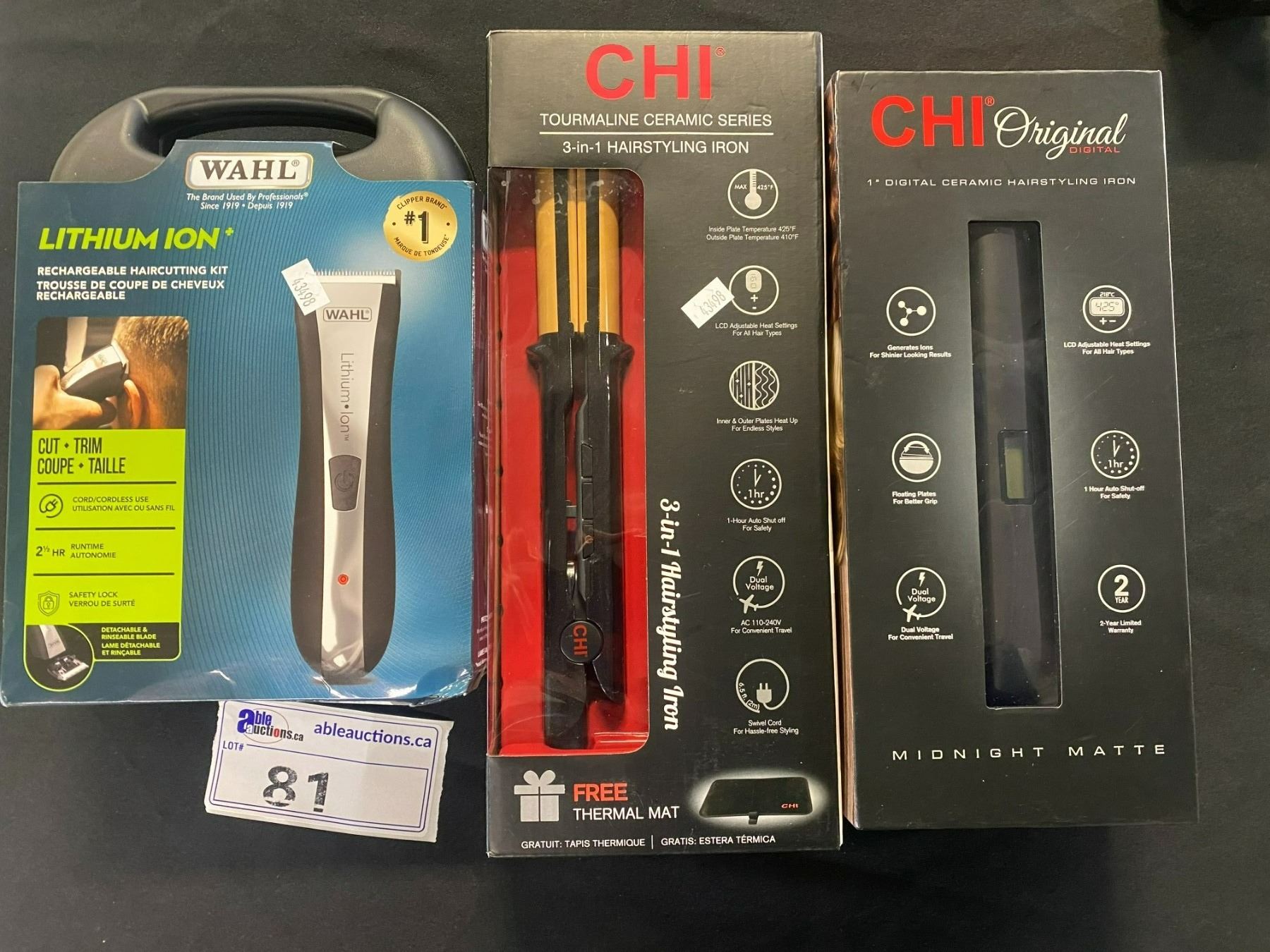CHI TOURMALINE CERAMIC SERIES 3 IN 1 HAIR STYLING IRON, CHI ORIGINAL 1" DIGITAL DISPLAY CERAMIC HAIR STYLING IRON, AND WAHL RECHARGEABLE HAIR CUTTING KIT
