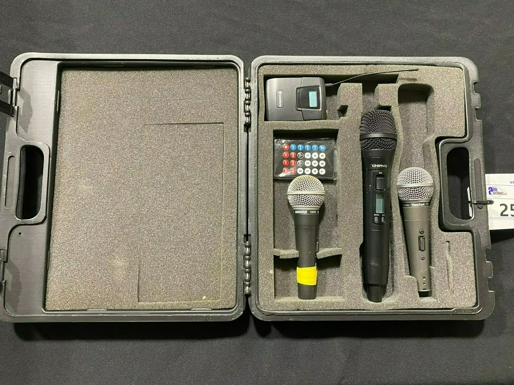 CHIAYO IRDA WIRELESS MICROPHONE WITH PORTABLE RECEIVER, SHURE SM58 MICROPHONE, PROLOGUE TENLUX PRO-30 MICROPHONE AND PADDED CARRY CASE