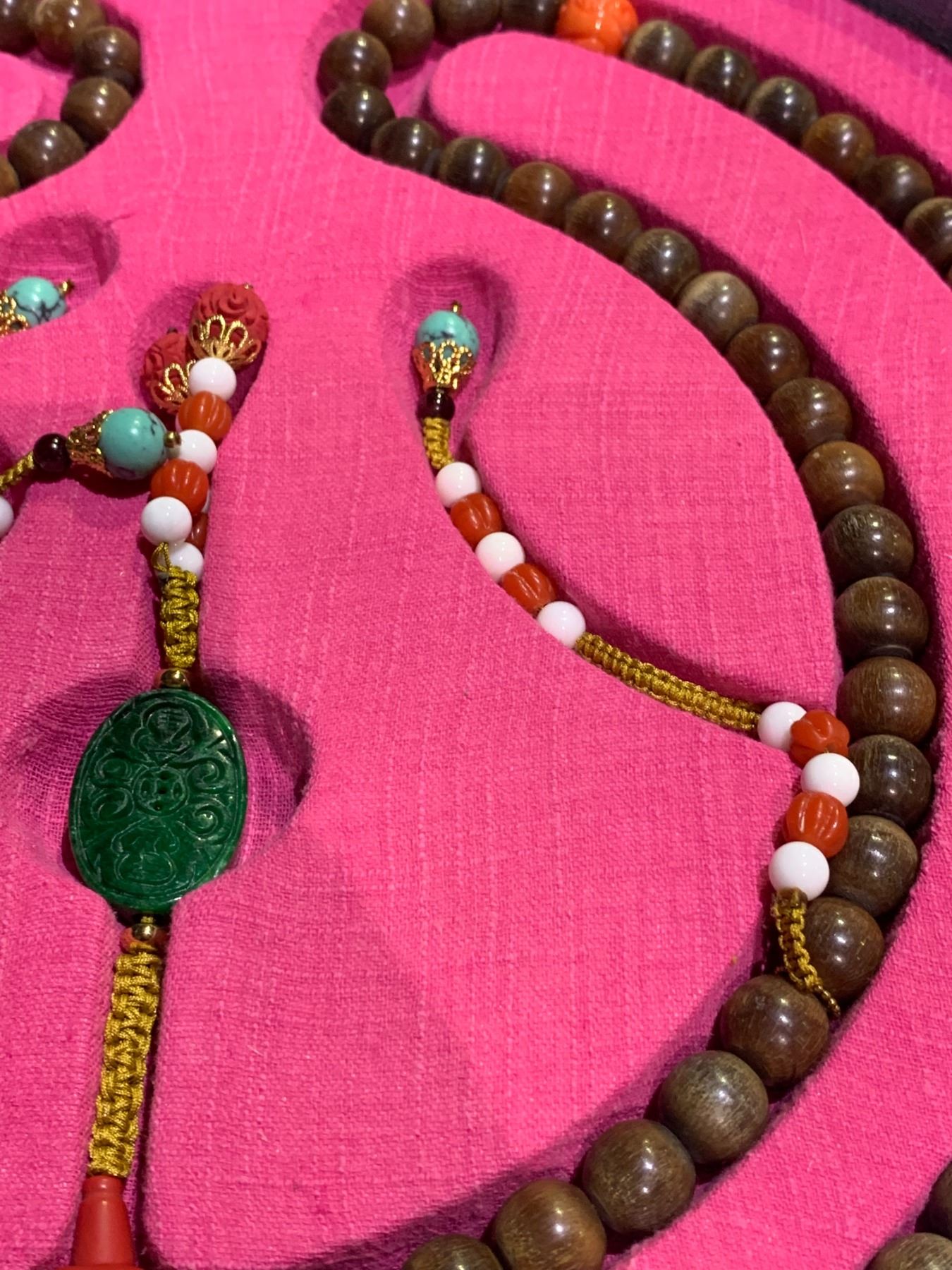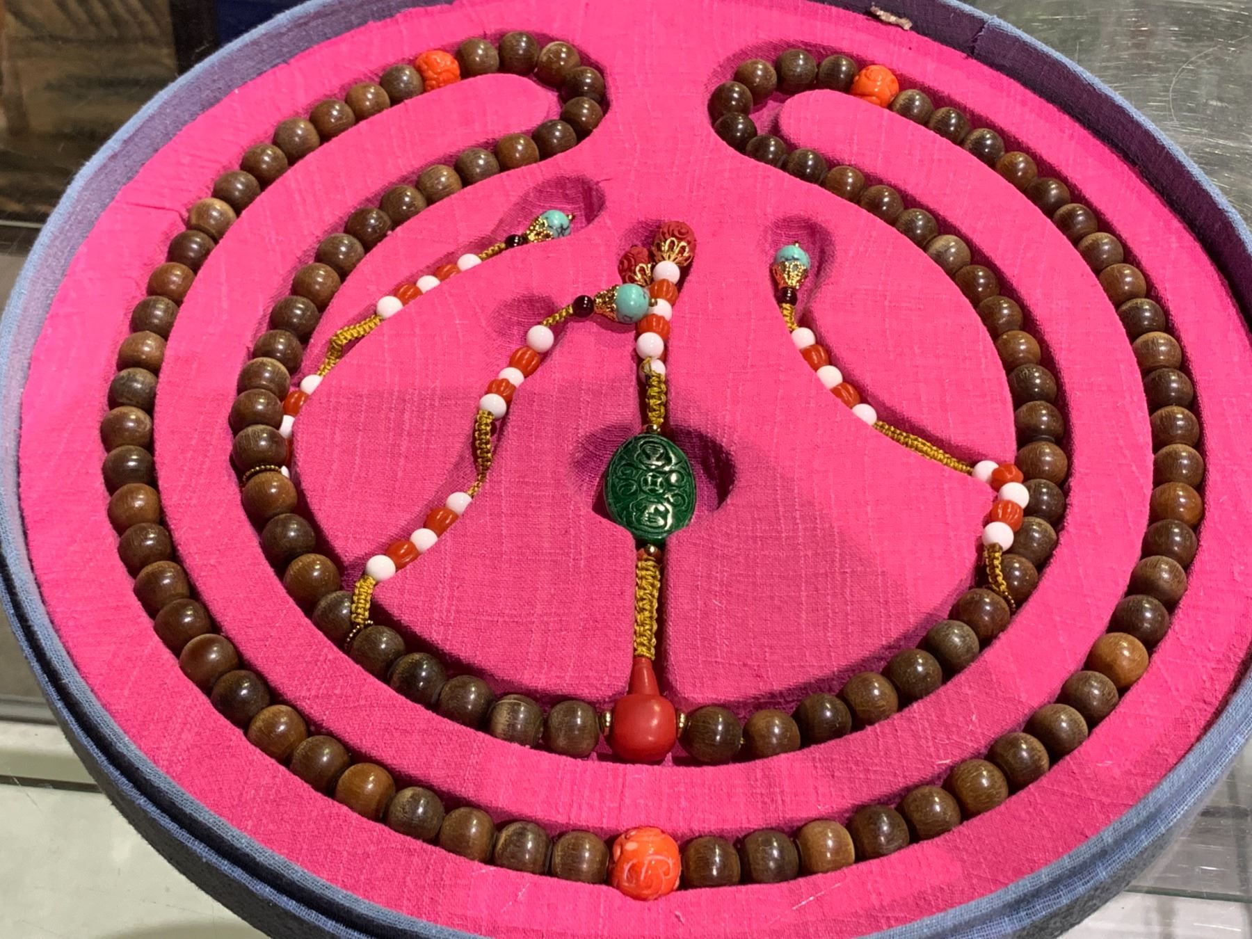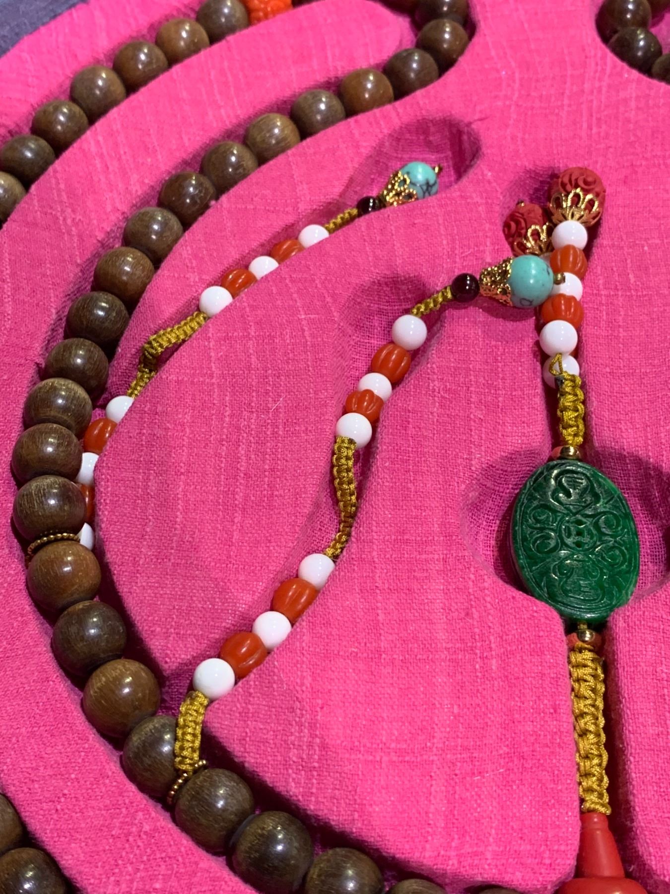 CHINESE HORN BEADS MANDARIN COURT NECKLACE WITH JADEITE, CONCH BEADS AND CORAL BEADS PENDANT
