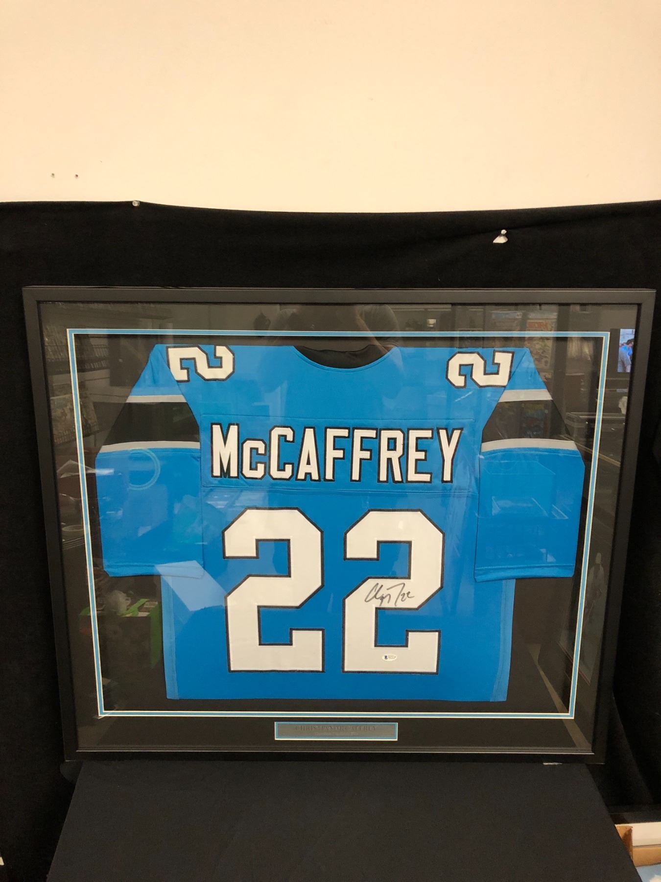 CHRISTIAN MCCAFFREY SIGNED AND CUSTOM FRAMED PANTHERS JERSEY (BECKETT COA)