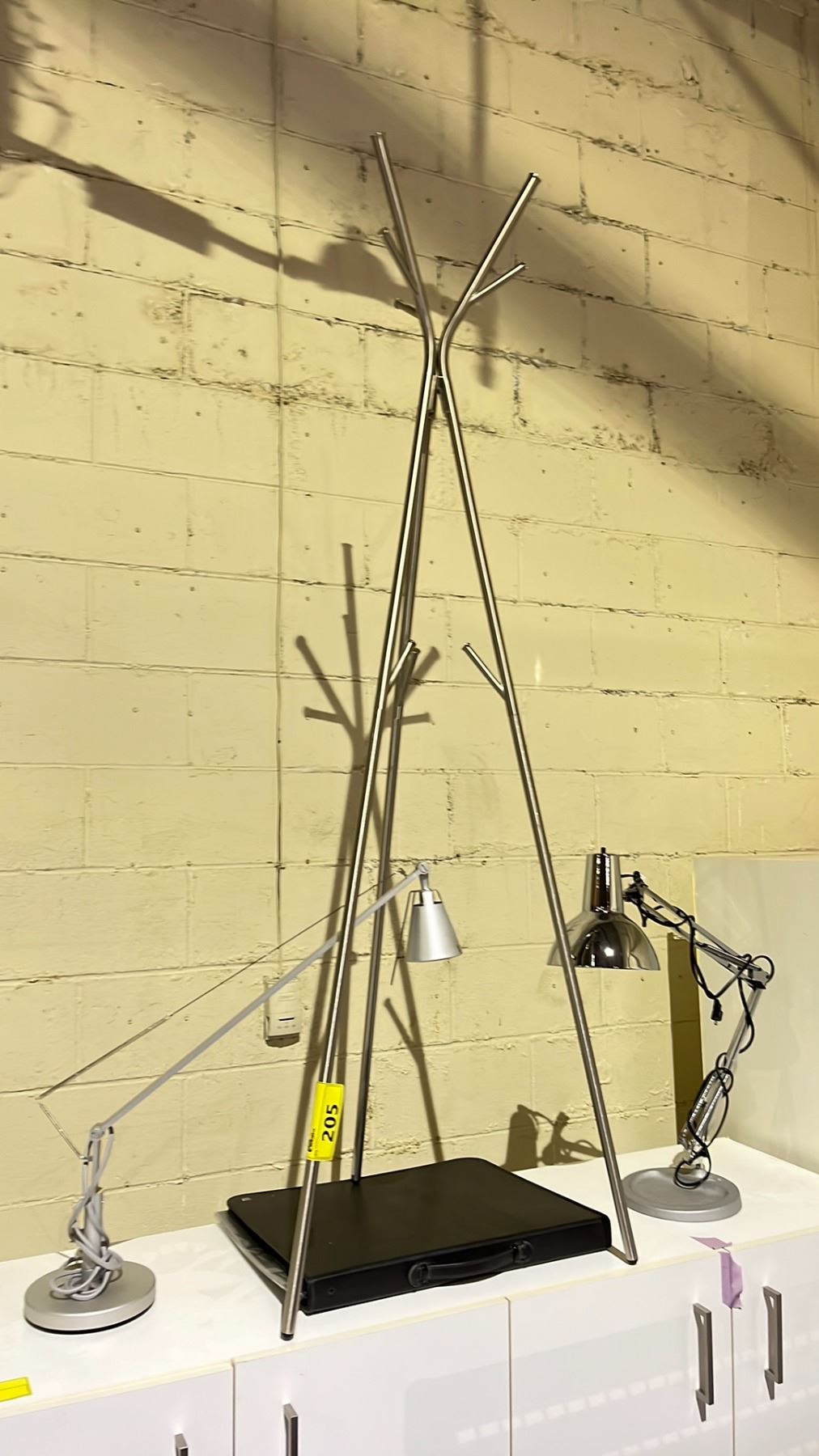 CHROME FINISH COAT RACK, 2 DESK LAMPS AND PORTFOLIO CASE