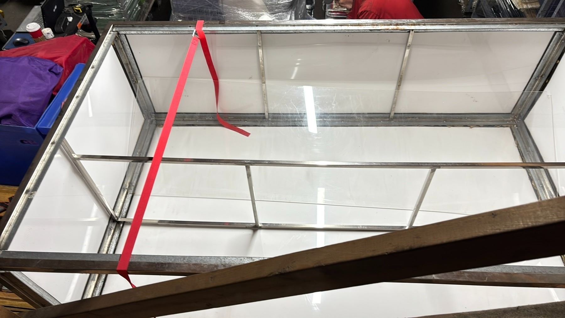CHROME FRAMED 72"W X 22"D X 42"WHITE PLASTIC COMMERCIAL 2 TIER EVENT PODIUM