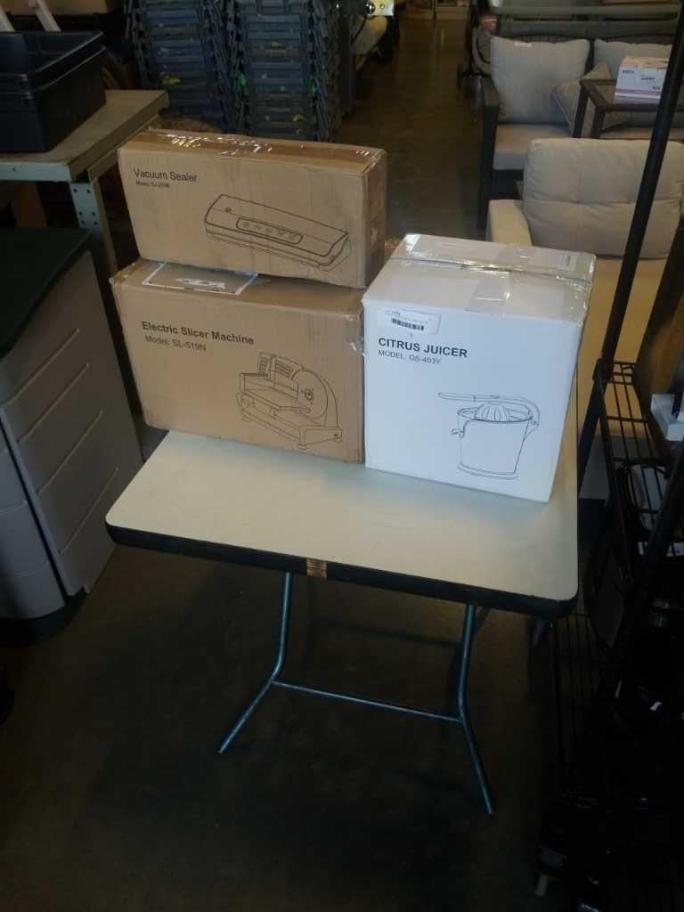 CITRUS JUICER, ELECTRIC MEAT SLICER, AND VACUUM SEALER - AMAZON RETURN, UNTESTED ITEMS