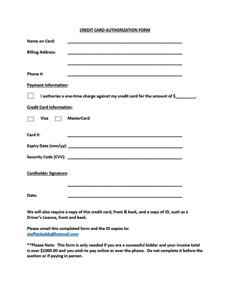 We accept Cash, Debit, Visa, MasterCard, E-transfer, Money Order or Bank Draft as payment. After the auction closes, all payments using a credit card with purchases under $1,000 will be processed. If your purchase is over $1,000 and you wish to pay by credit card online or over the phone, you will need to complete our Credit Card Authorization Form. **NOTE: this only needs to be completed AFTER the auction if you're a successful bidder. This is not necessary if you are using your credit card in person. E-transfers are sent to bob@doddsauction.com