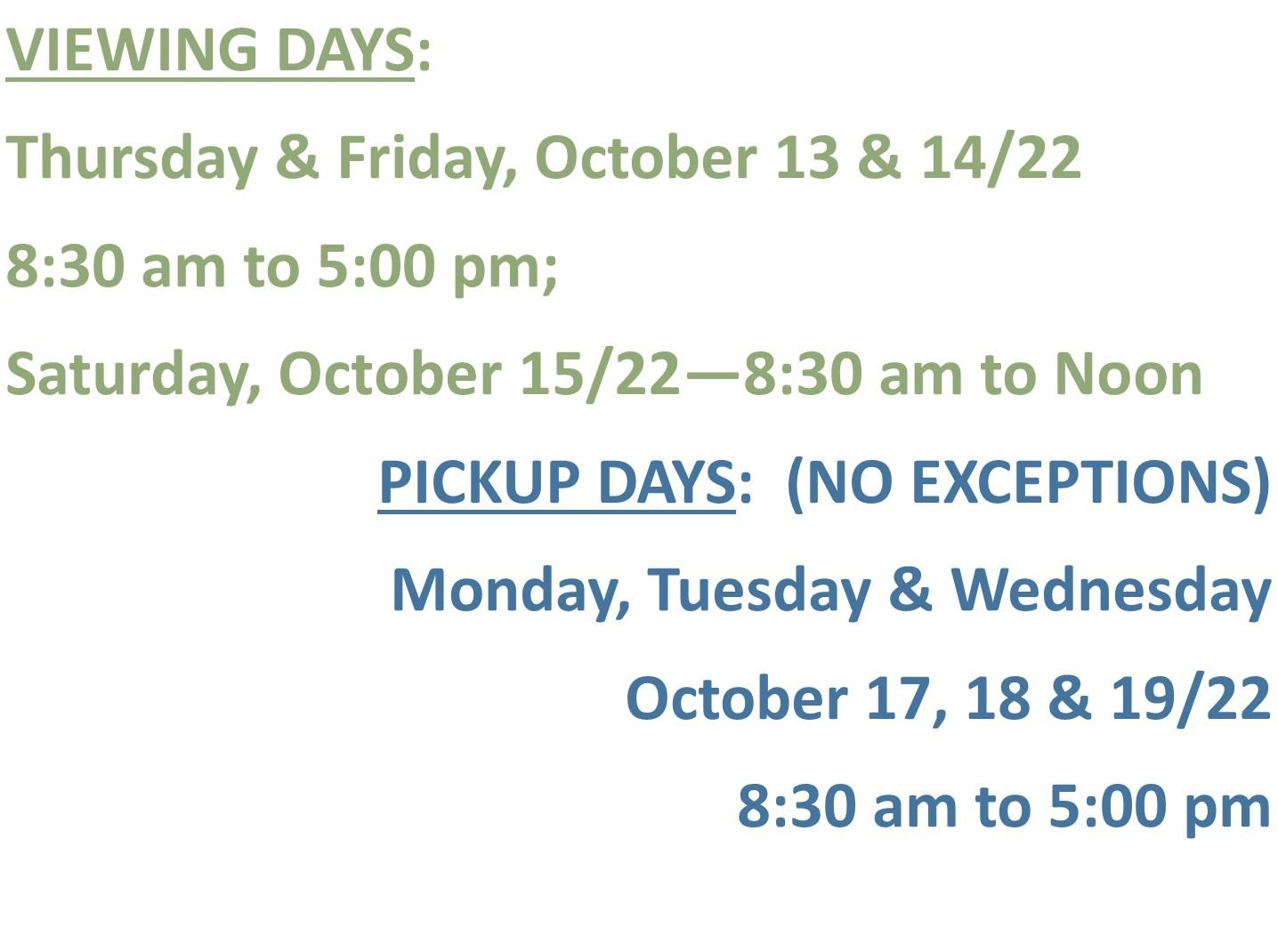 ITEMS NOT PICKED UP BY WED. OCT. 19/22 5PM ARE CONSIDERED ABANDONED & NO REFUND GIVEN. NO EXCEPTIONS.