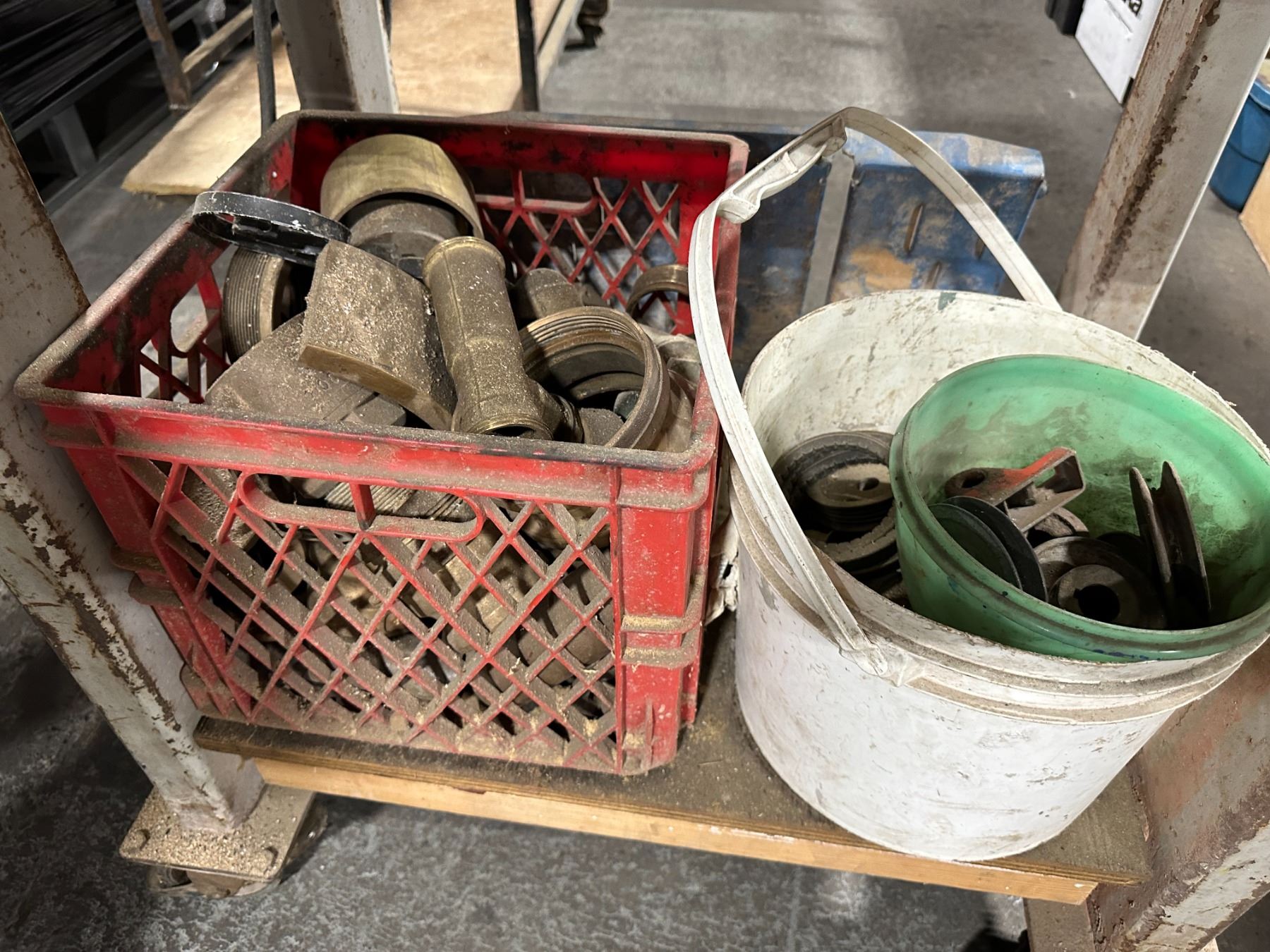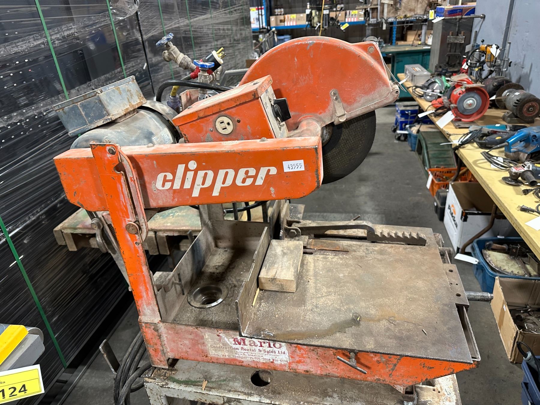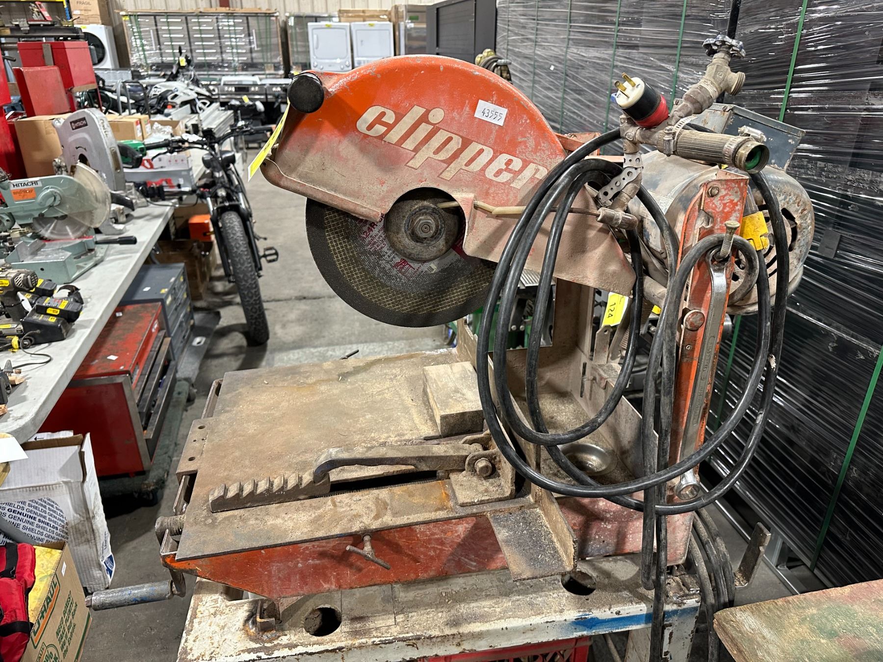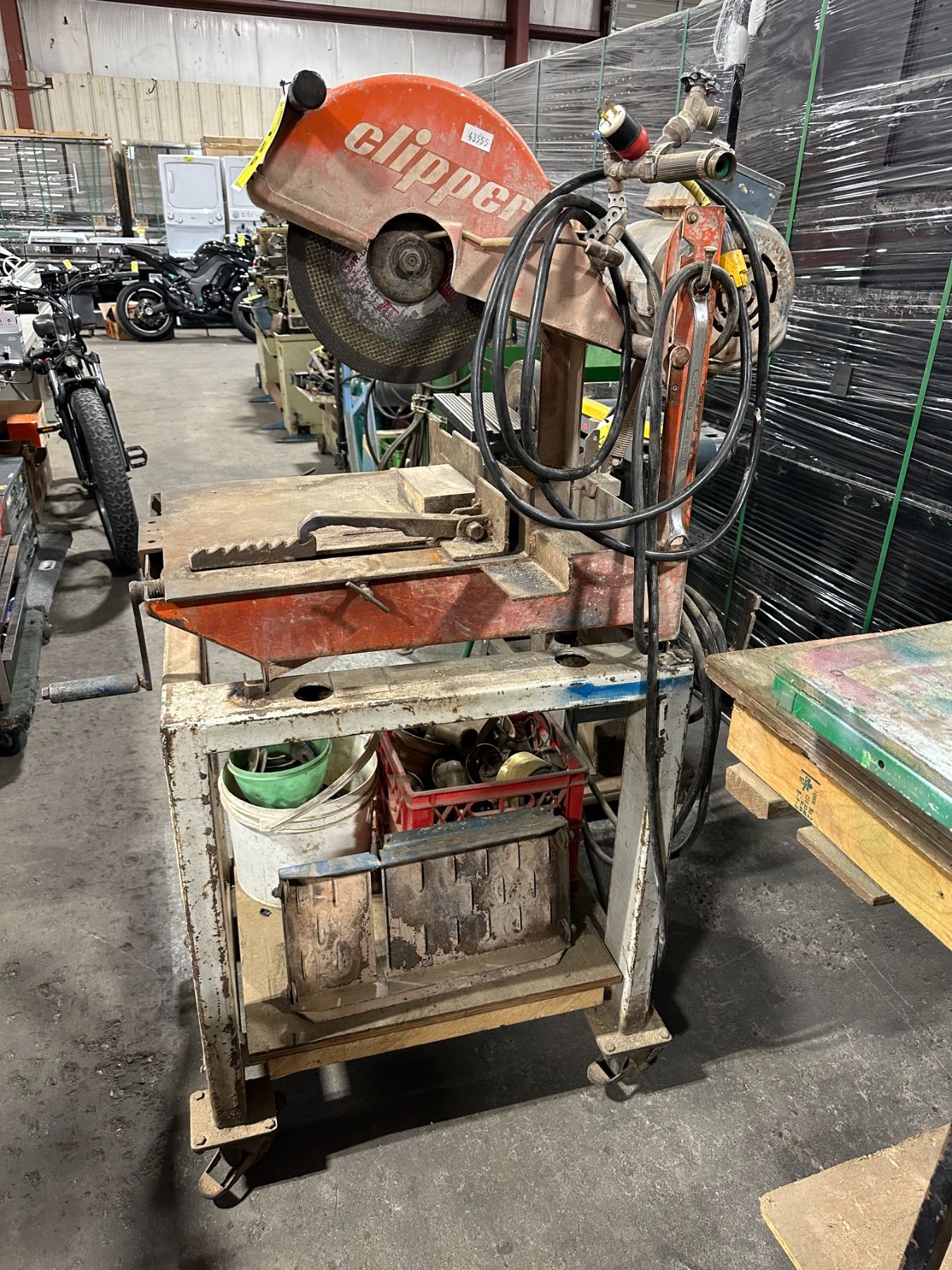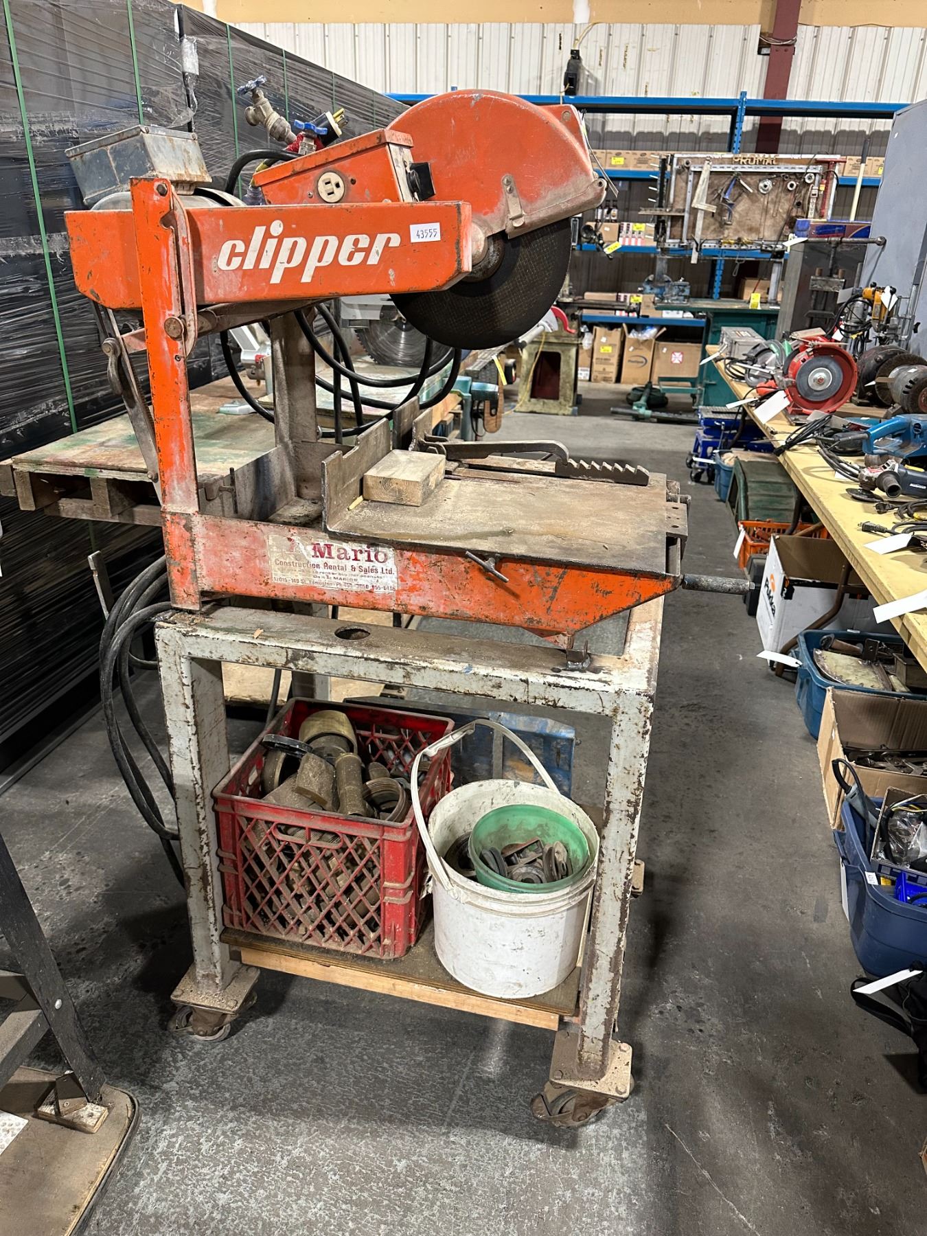 CLIPPER ORANGE DUAL VOLTAGE INDUSTRIAL METAL CUTTING CHOP SAW ON HEAVY DUTY MOBILE STAND WITH CONTENTS