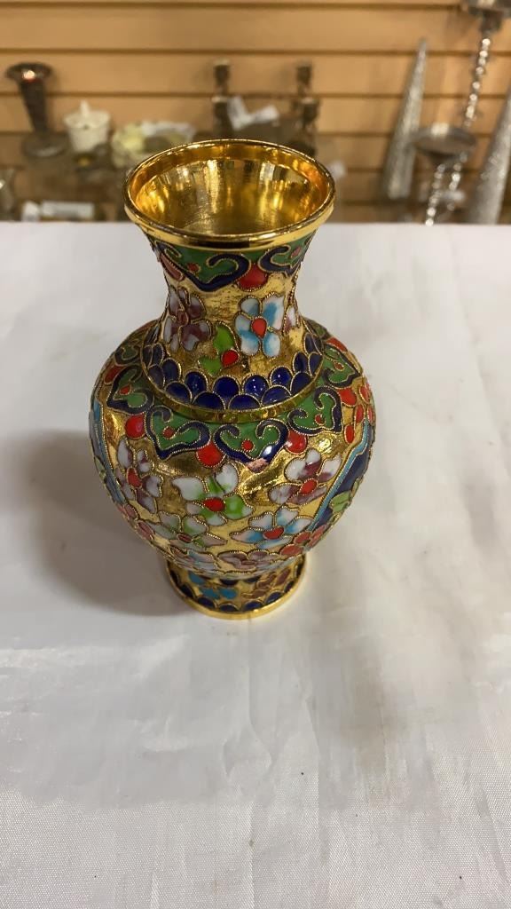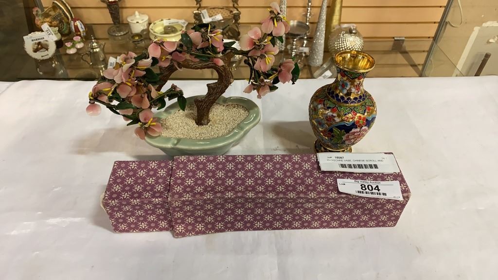 CLOISONNE VASE, CHINESE SCROLL AND JADE TREE