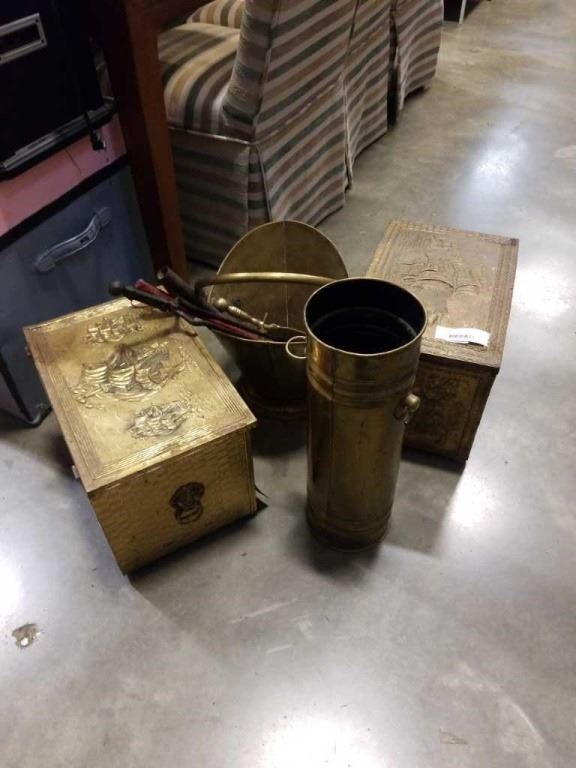 COAL SCUTTLE WITH TOOLS, BRASS BOX AND UMBRELLA STAND