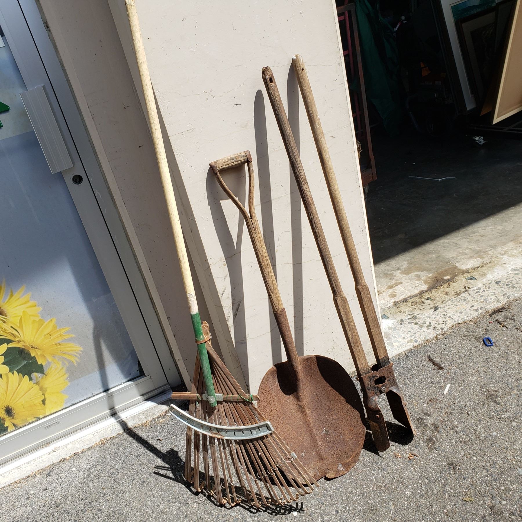 COAL SHOVEL, POST HOLE SHOVEL, AND RAKE