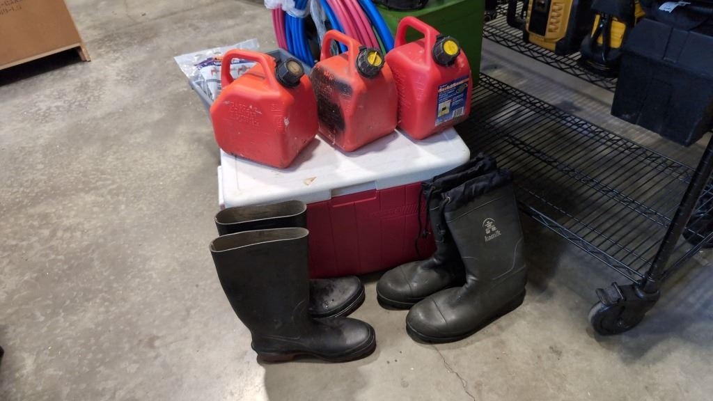 COLEMAN COOLER, TWO PAIRS OF SIZE 11 GUM BOOTS AND 3 SMALL GAS CANS