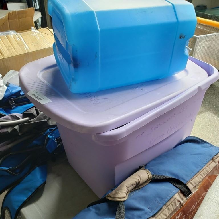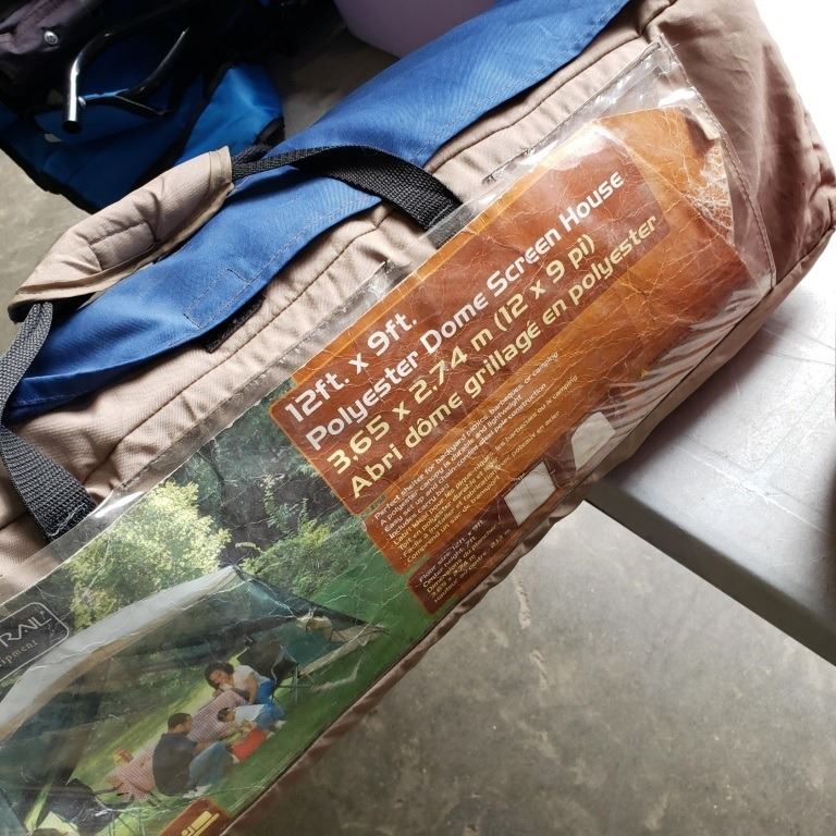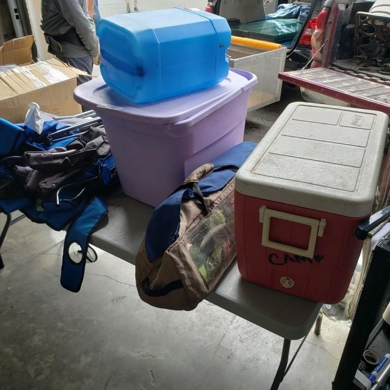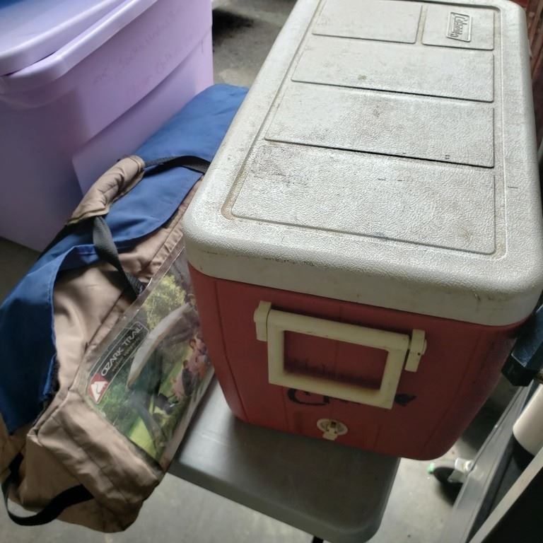 COLEMAN COOLER WITH OZARK TRAIL SCREEN HOUSE, 4 FOLDING CHAIRS AND MORE