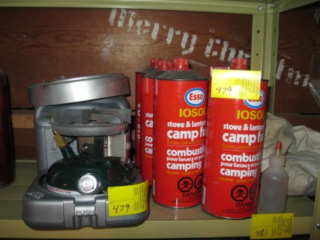 COLEMAN SINGLE BURNER GAS STOVE W/4 ALMOST EMPTY CONTAINERS OF CAMP FUEL