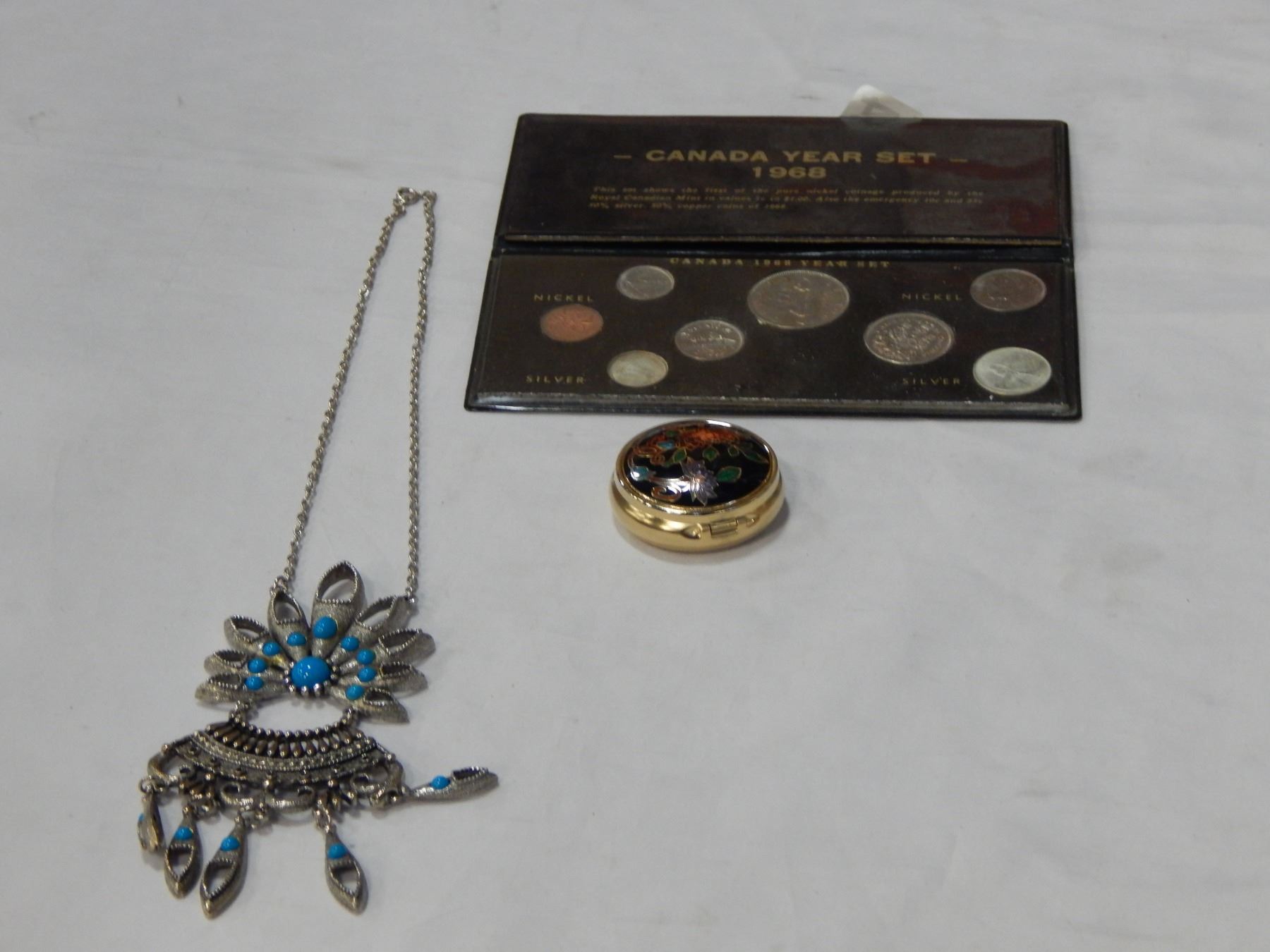 COLLECTABLE COINS, SMALL CLOISONNE STYLE BOX AND NECKLACE