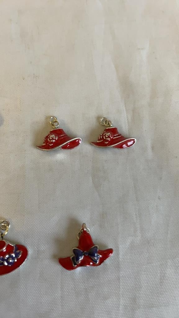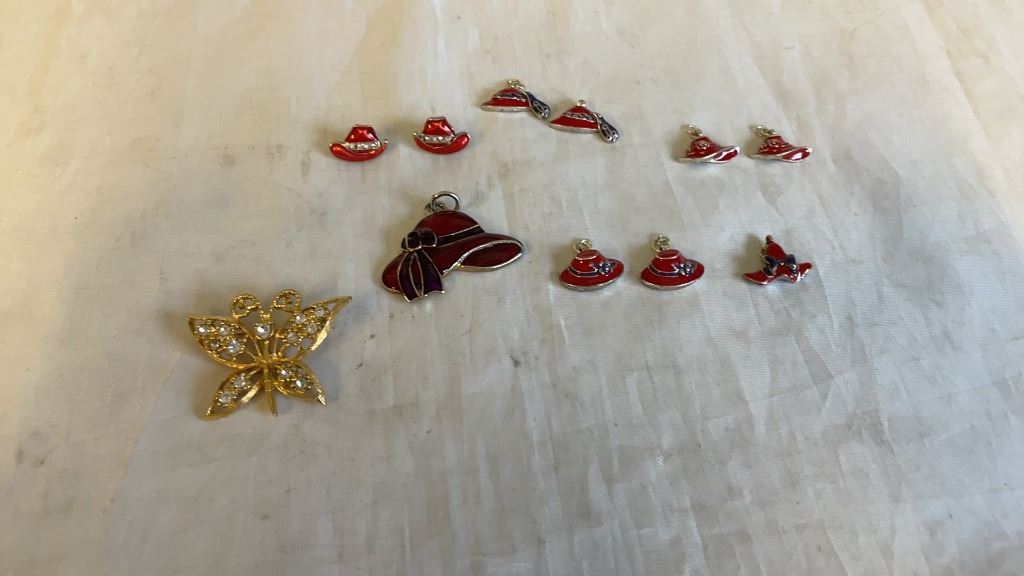 COLLECTION OF RED HAT PENDANT, CHARMS, AND EARRING WITH BUTTERFLY BROOCH