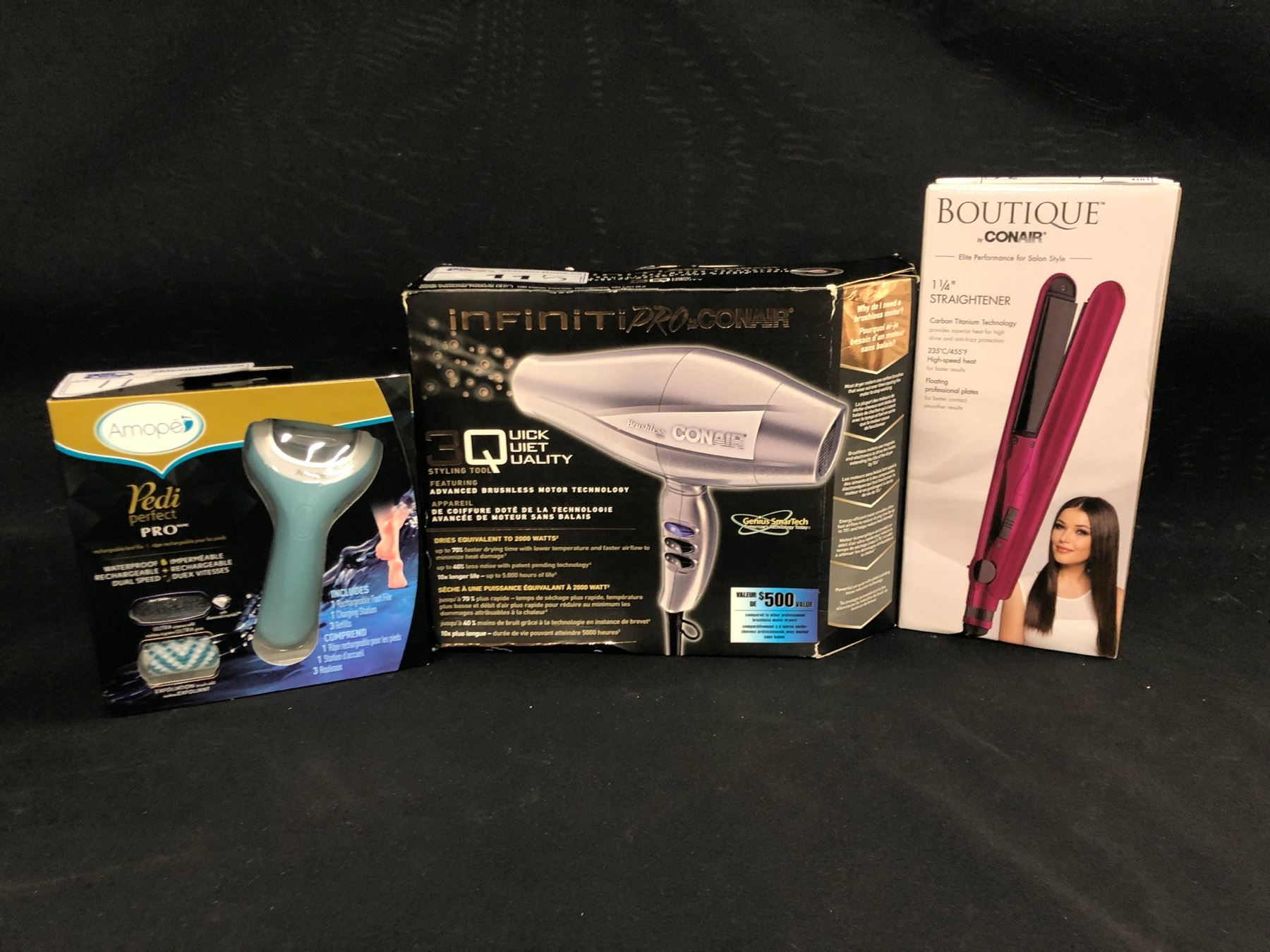 CONAIR INFINITI PRO HAIR DRYER, CONAIR BOUTIQUE 1 1/4" STRAIGHTENER AMOPE PEDI PERFECT PRO