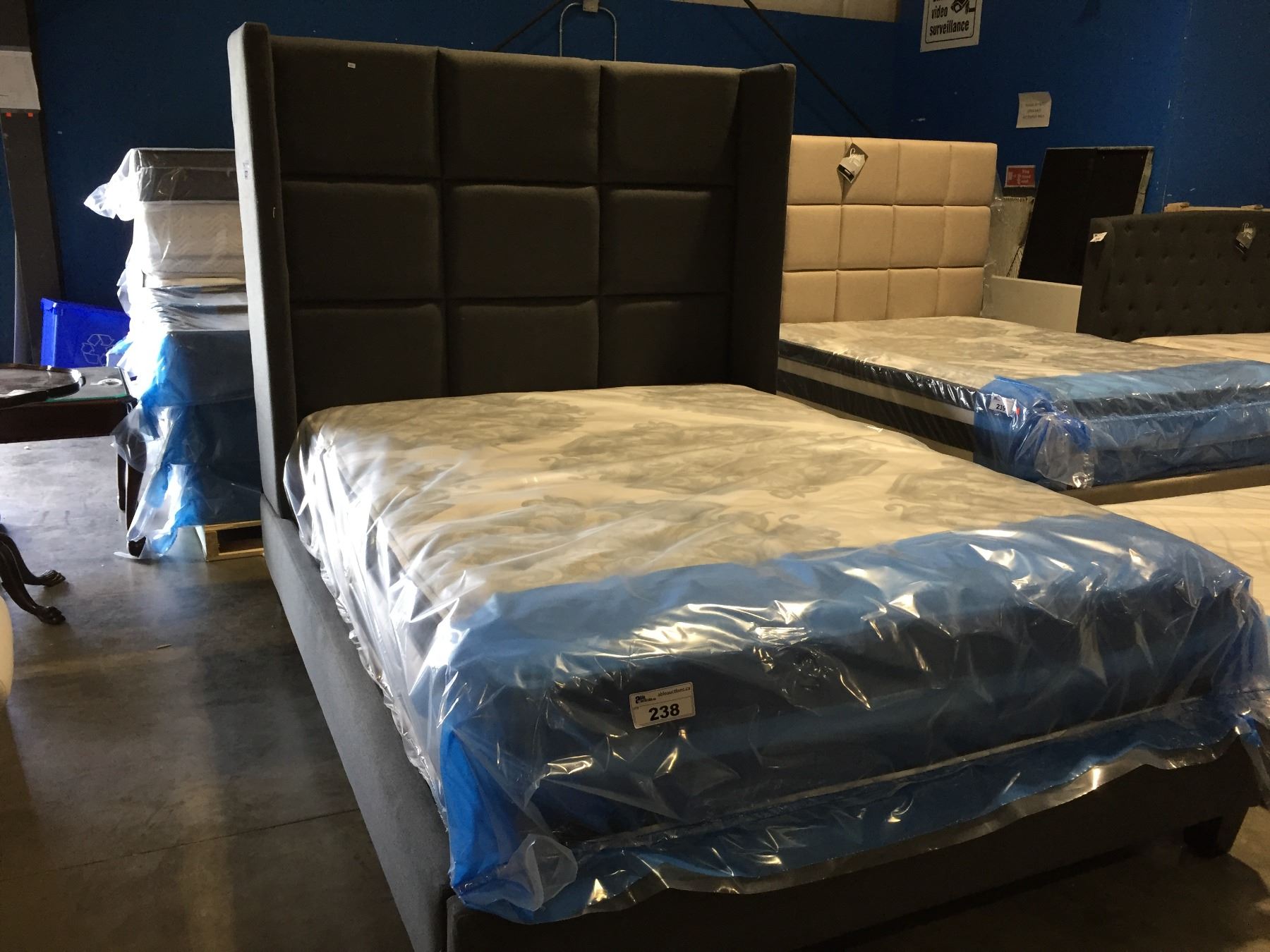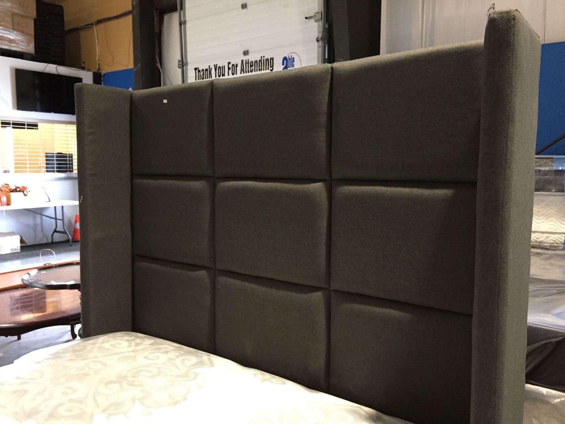 CONTEMPORARY/MODERN DARK GREY UPHOLSTERED QUEEN SIZE BEDFRAME (HEADBOARD/FOOTBOARD/RAILS & SLATS) MATTRESS NOT INCLUDED-NEW BUT WAS A DISPLAY-MSRP $1199