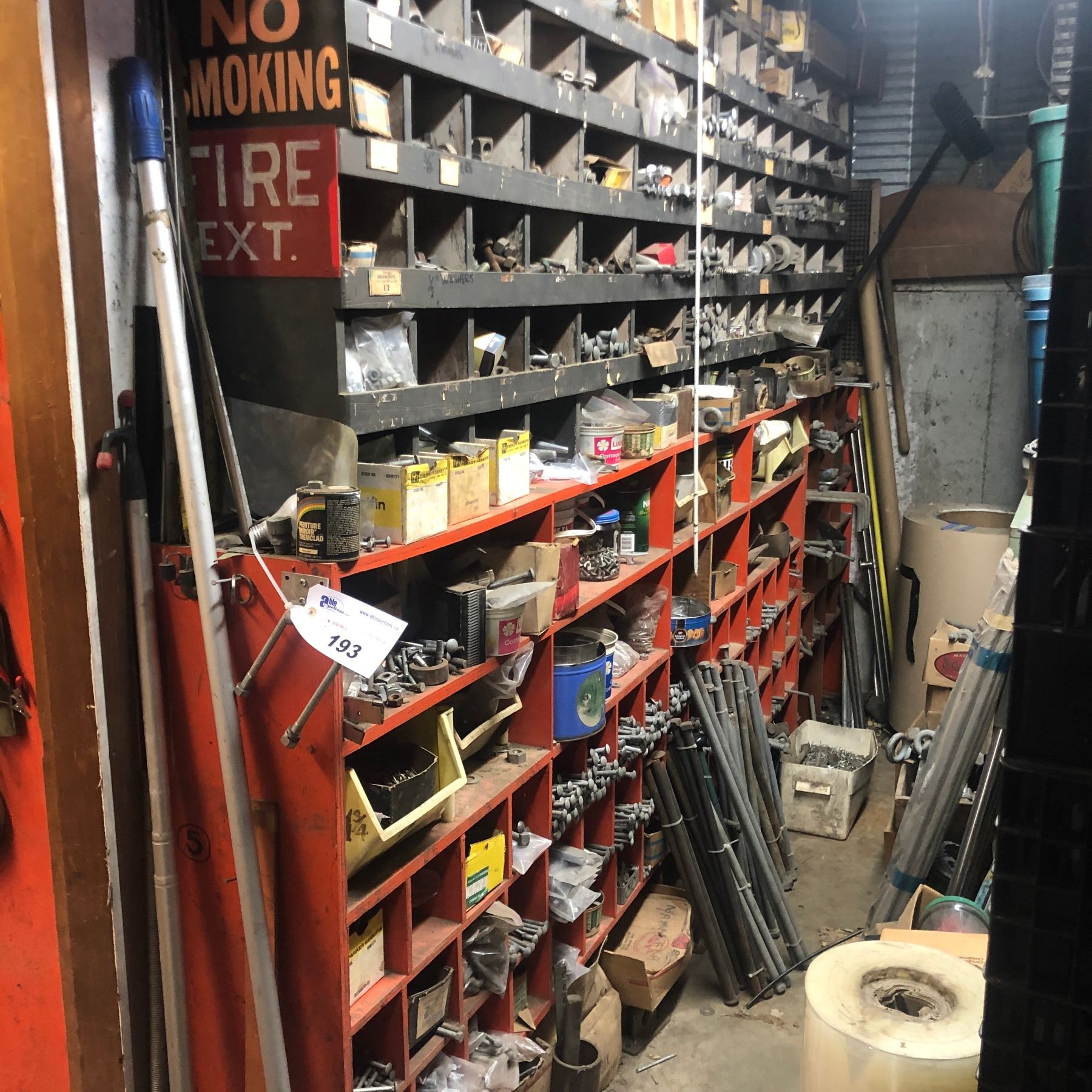 CONTENTS OF LEFT PARTS BINS INCLUDING HEAVY DUTY HARDWARE, PARTS AND MORE