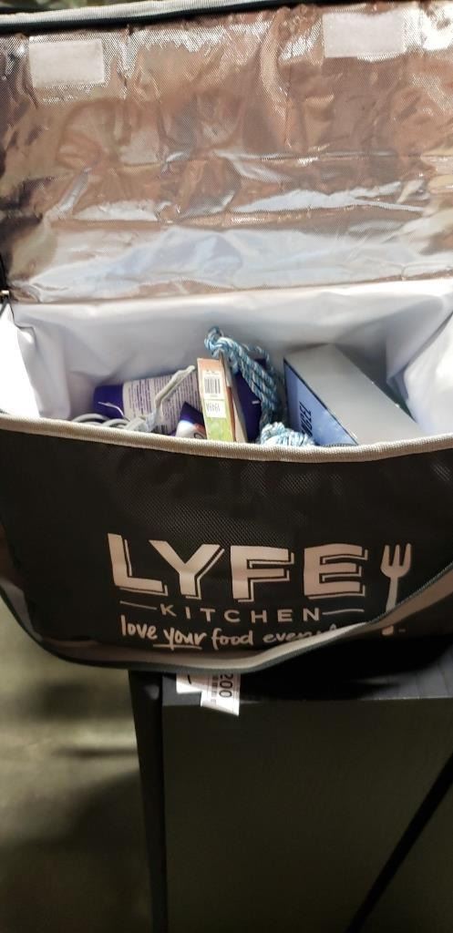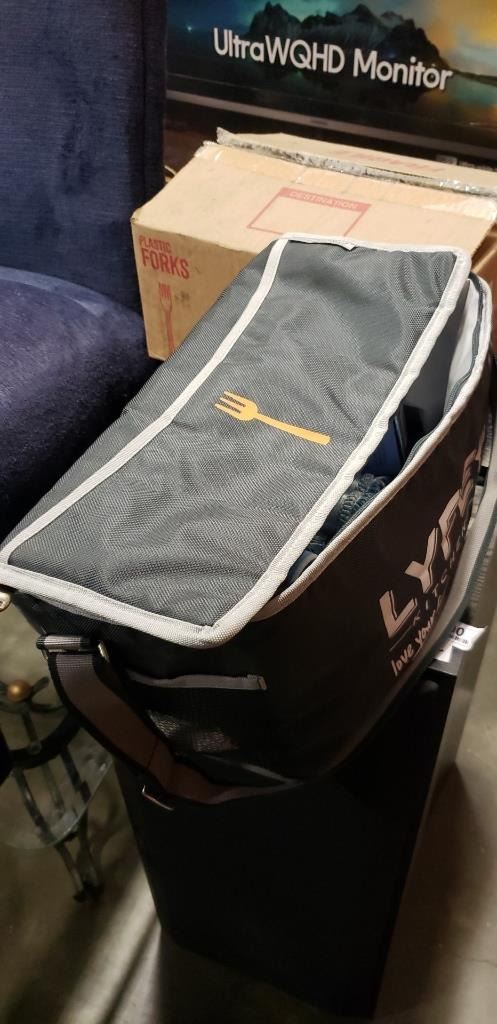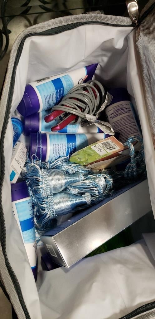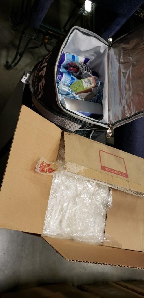 COOLER OF NEW BODY CREAMS LOTIONS AND BOX OF PLASTIC FORKS
