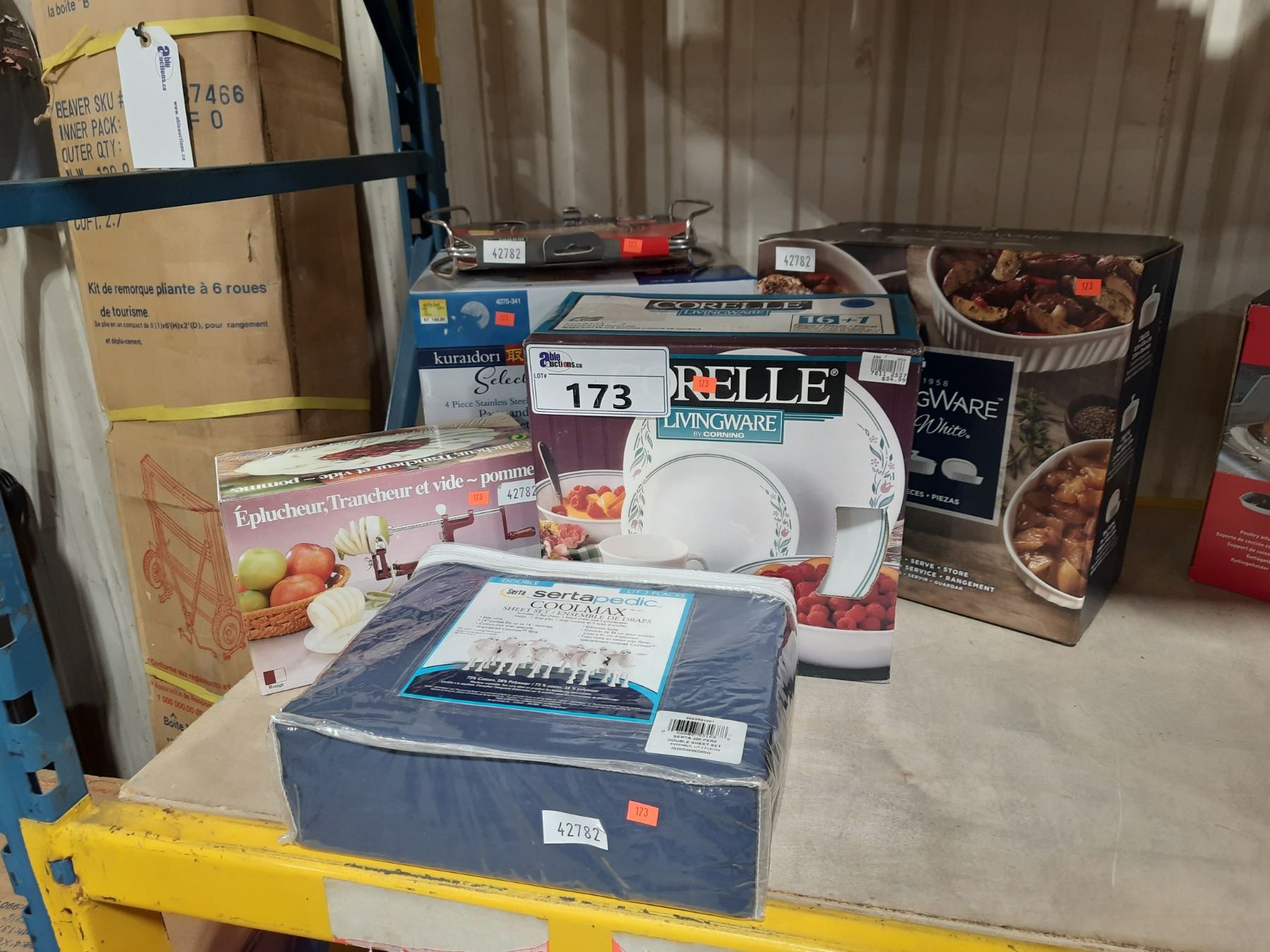CORNINGWARE SET, CORELLE DISHWARE SET, SERTA DOUBLE SHEET SET, APPLE PEELER, 4 PCS STAINLESS STEEL